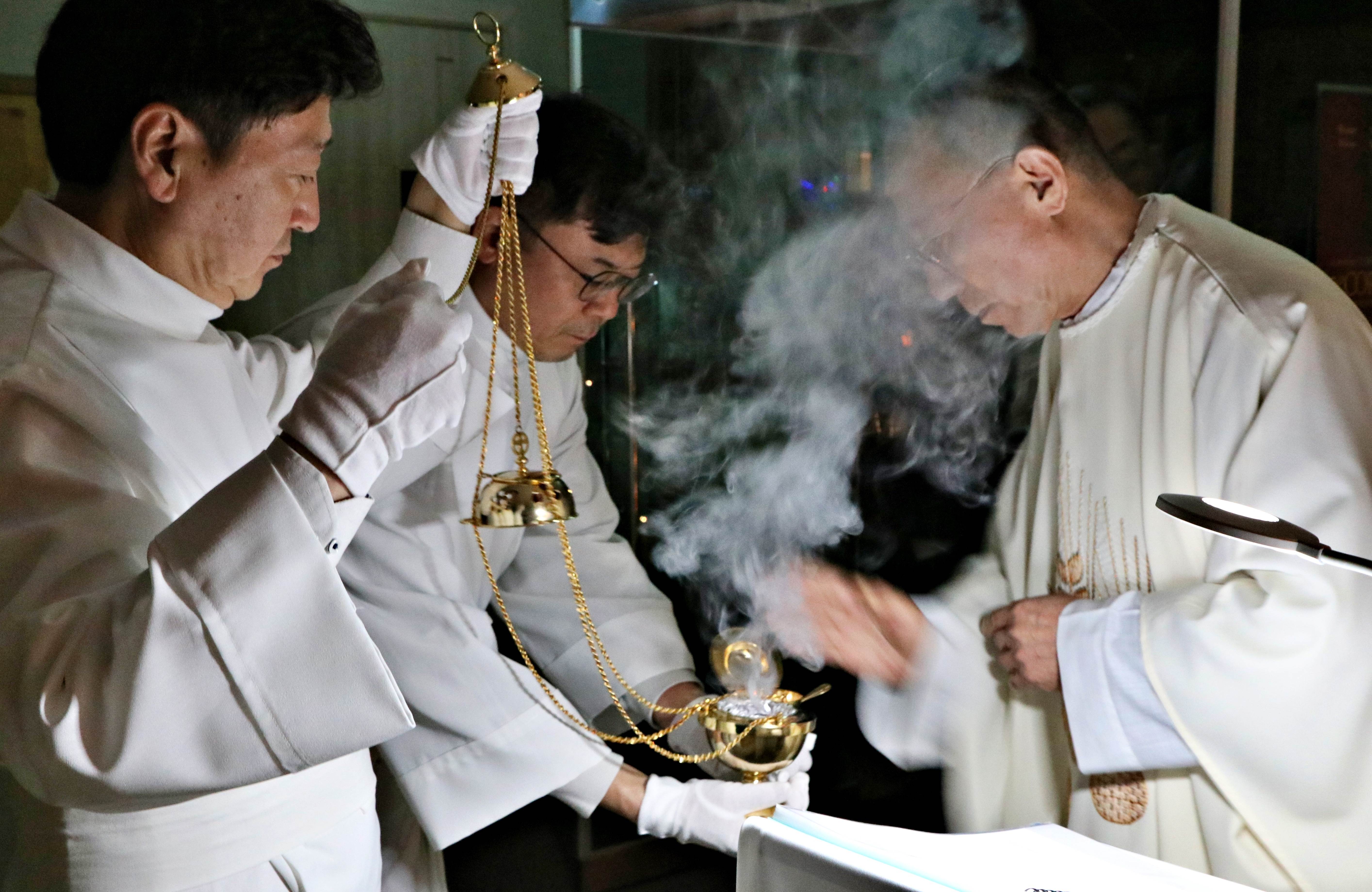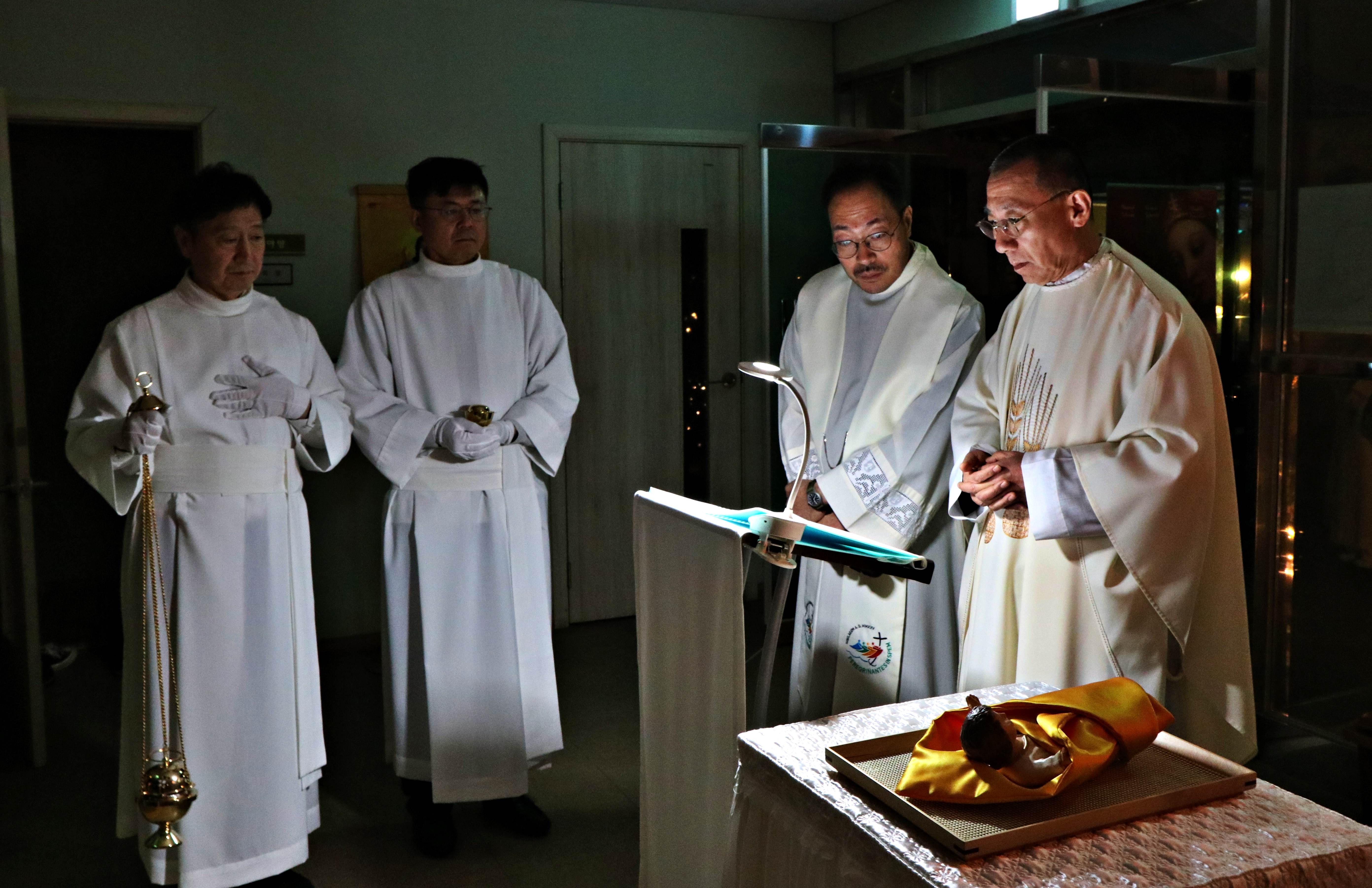 향> 초 > 향합> 협력사제>주례사제의 순서로 아기 예수상이 안겨져 입당하면서