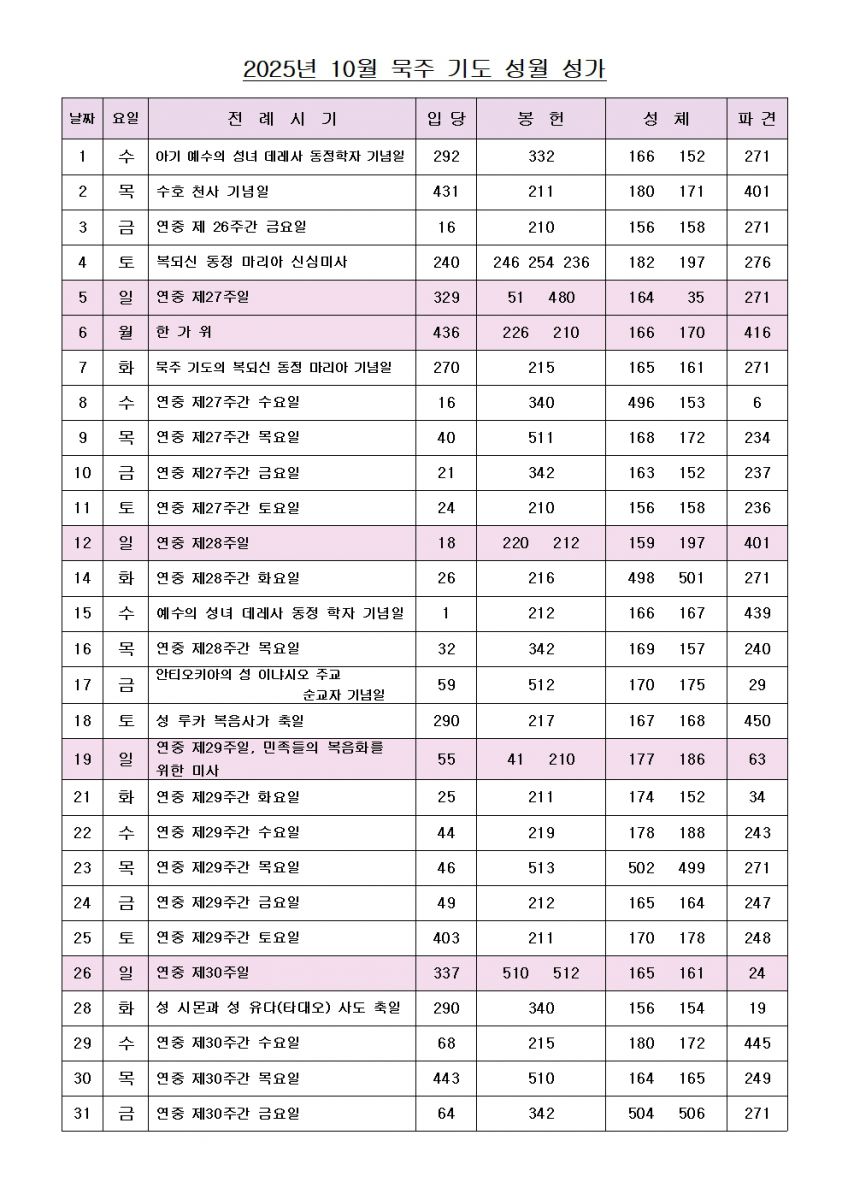 2025년 10월 성가 번호