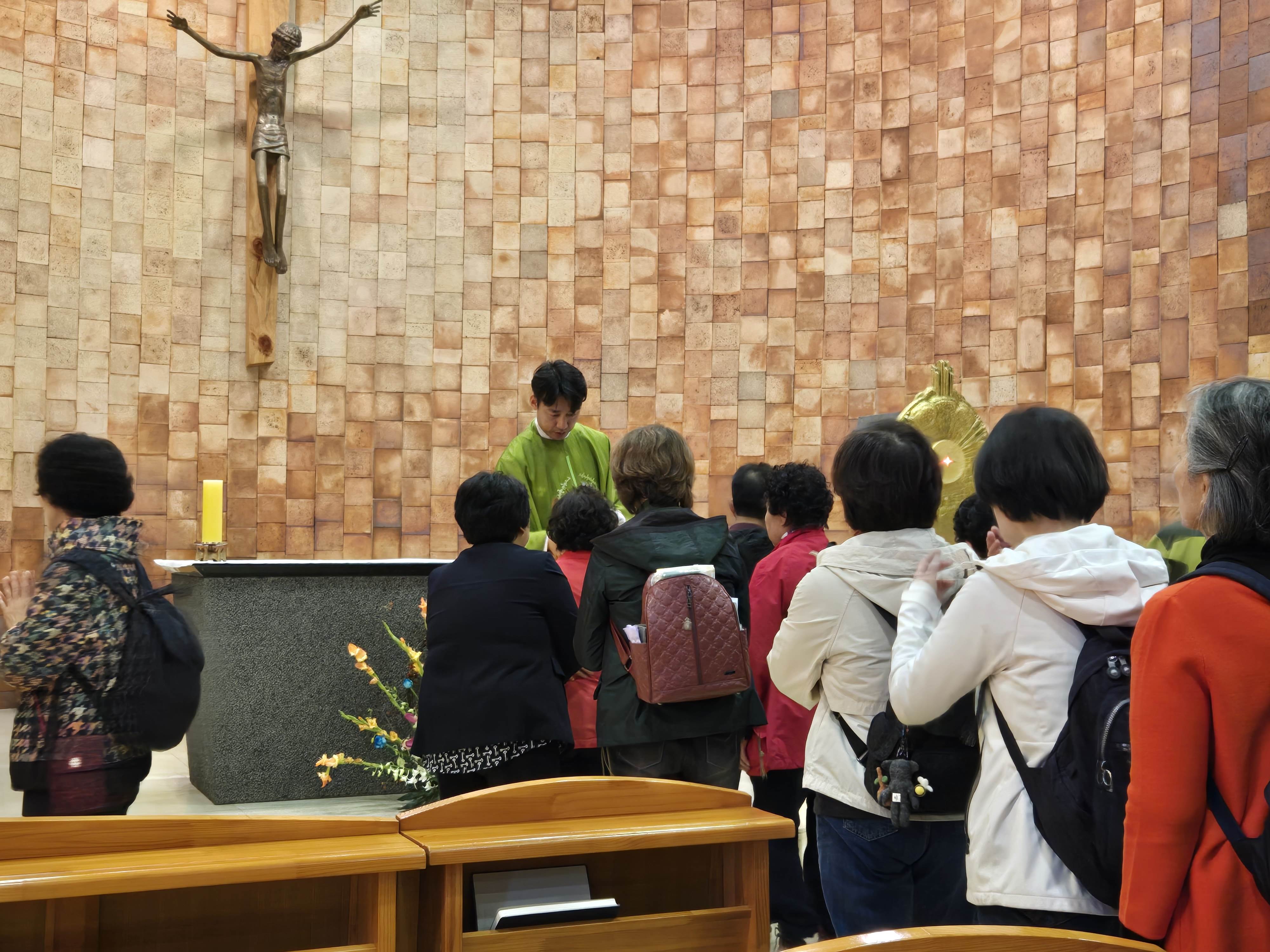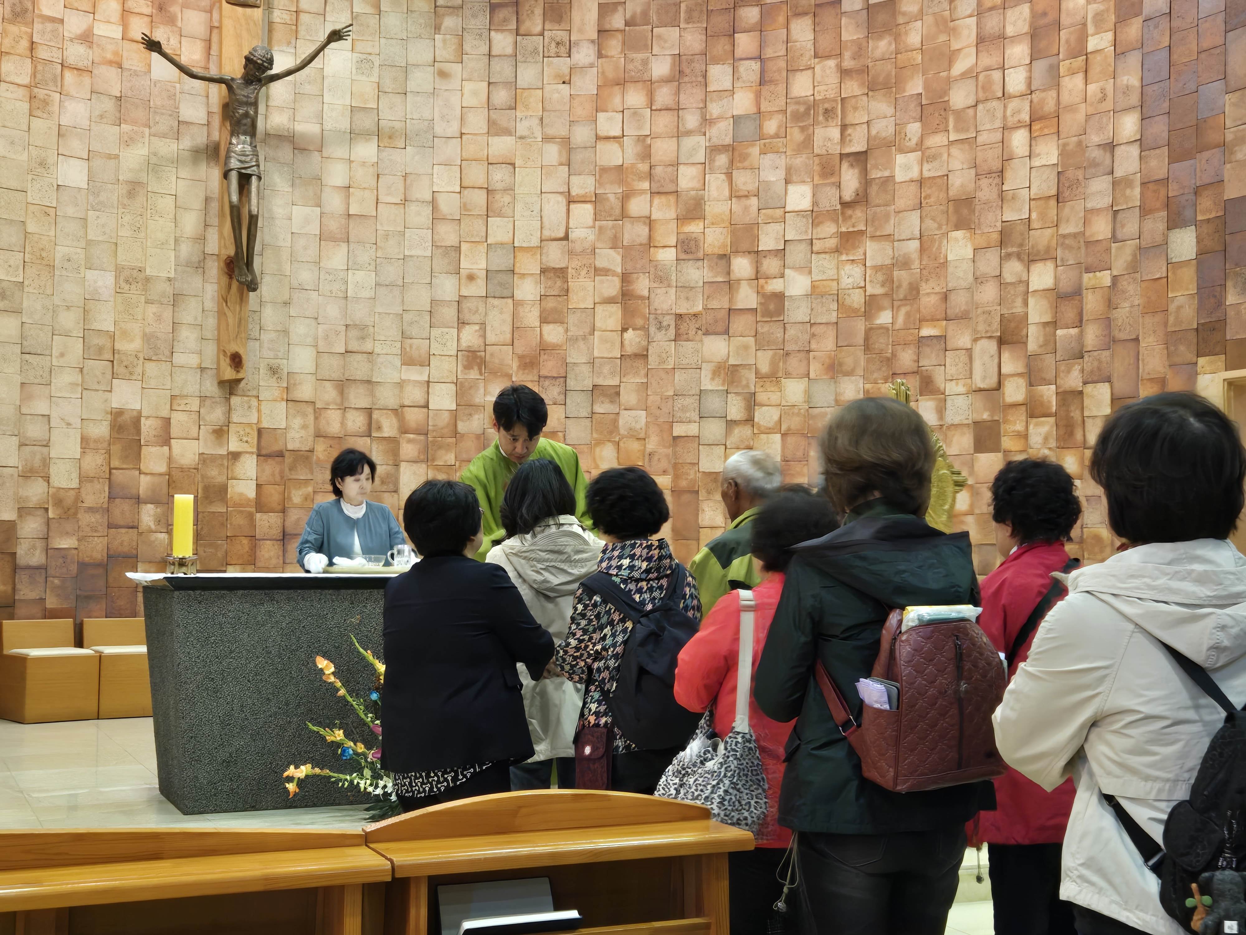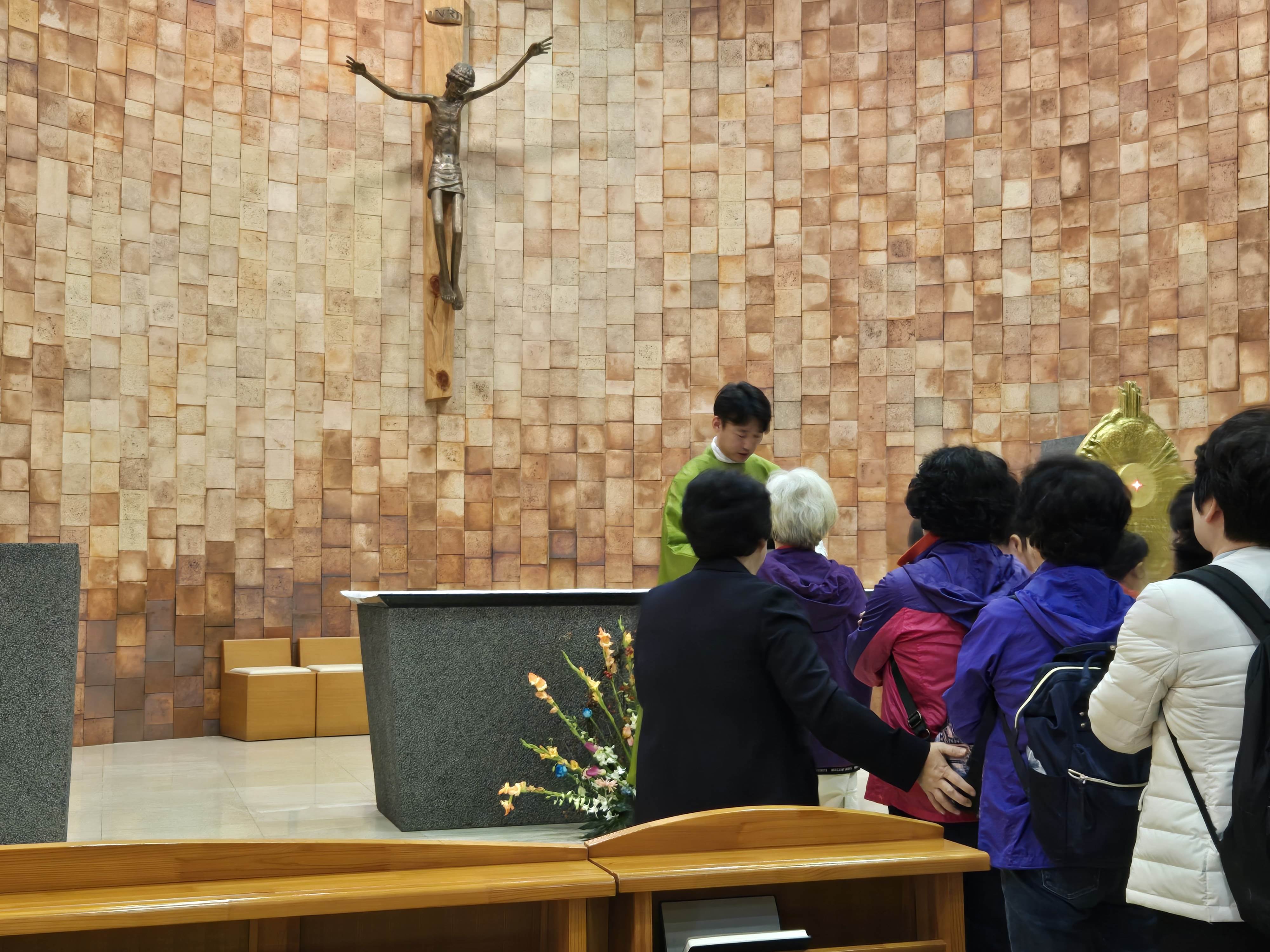 입구에 성모님상이 자리한 왼쪽뒤로 대성전. 스테인드글라스를 통해 들어낸 성전 내부는 신비자체의 빛으로 물들이고, 유쾌하면서도 묵직한 메시지 심어준 미사가 끝나고 깊은 믿음으로 경건한 마음으로 가슴에 손을 언고 거룩하신 주님께 이마를 내어 드립니다.