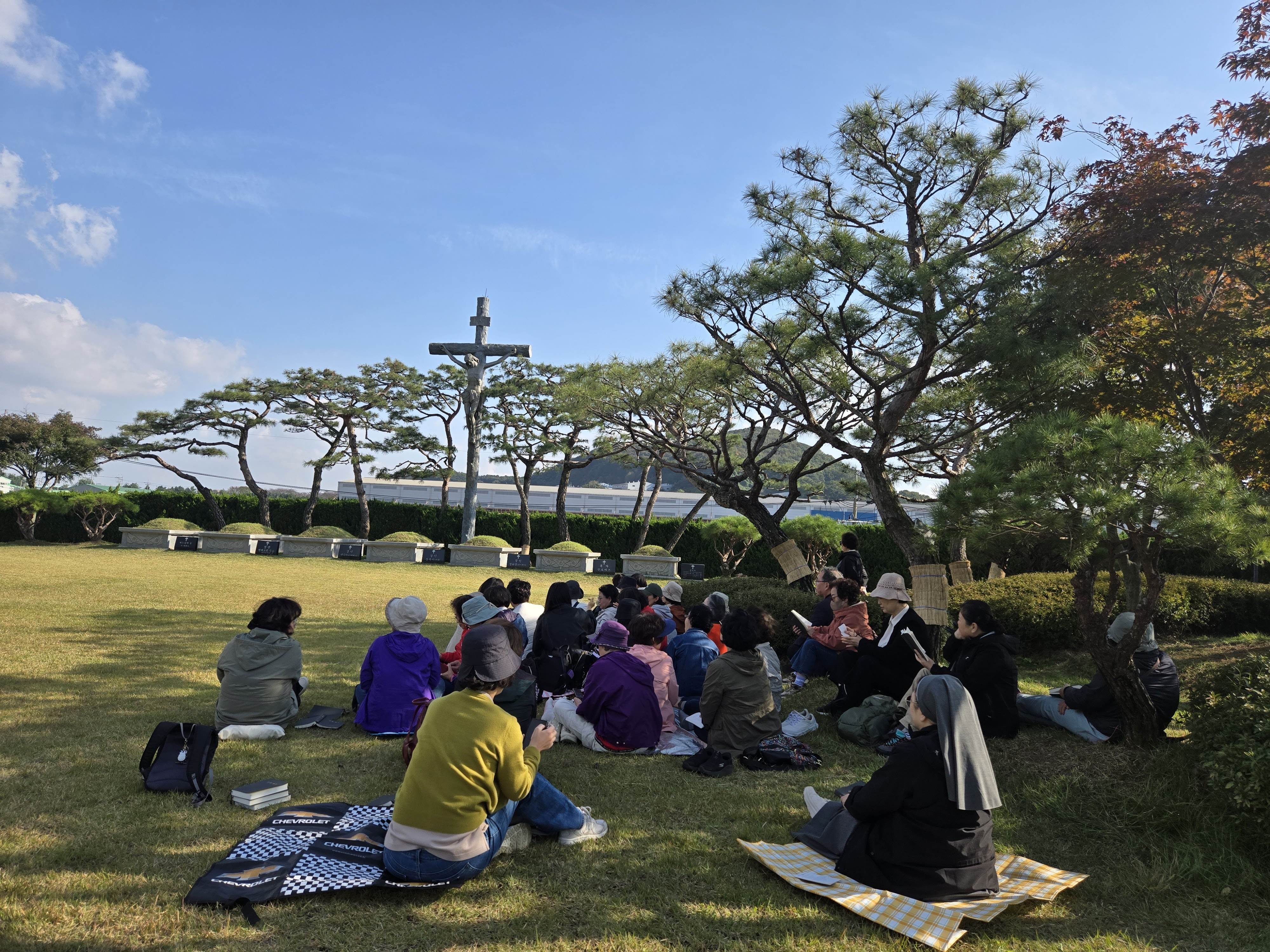 이어 1조. 2조가 묘역 앞에 앉아 연령을 위로하는 연도를 바쳤습니다.