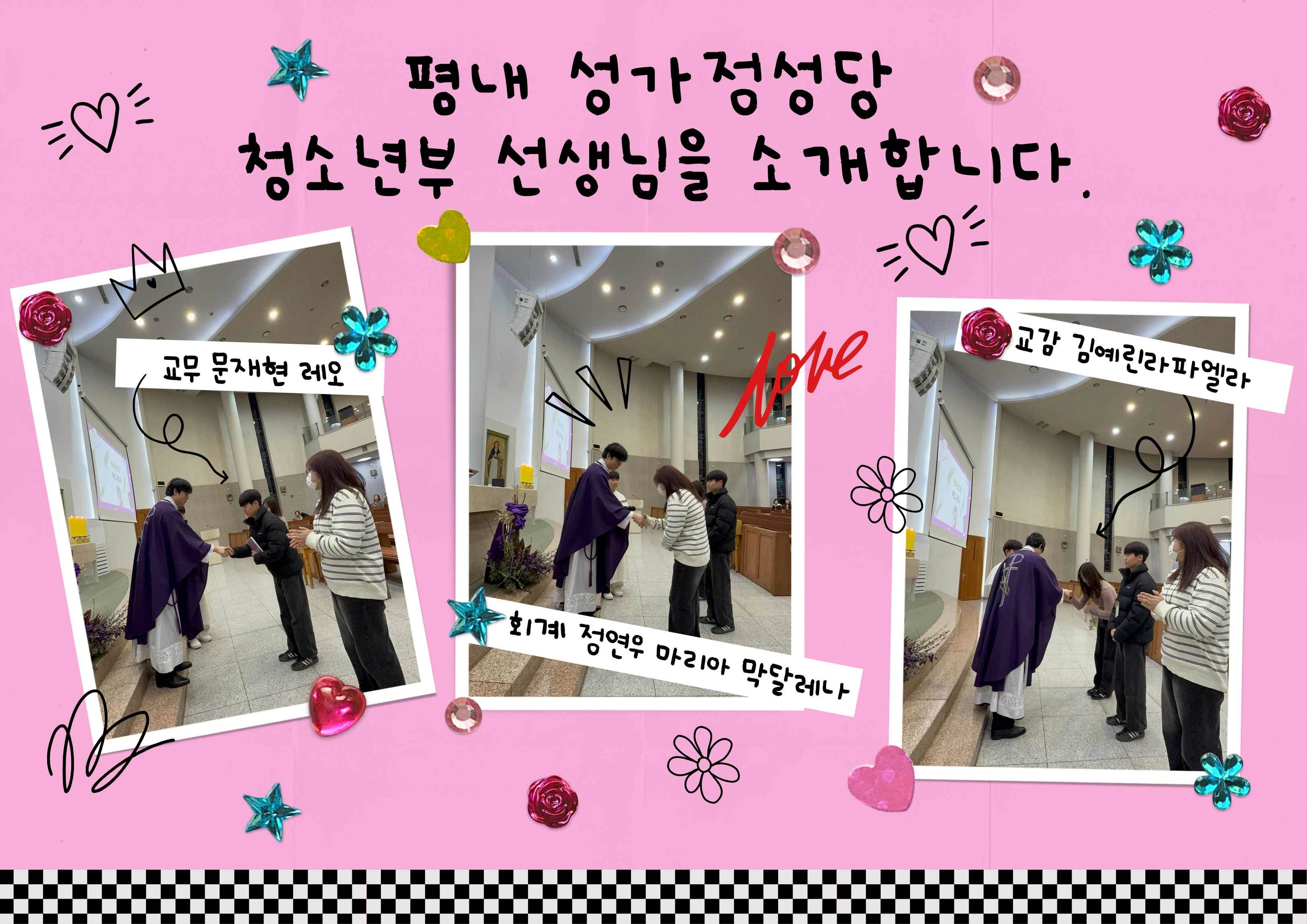 교감 김예린 라파엘라, 교무 문재현 레오, 회계 정연우 마리아 막달레나 선생님이