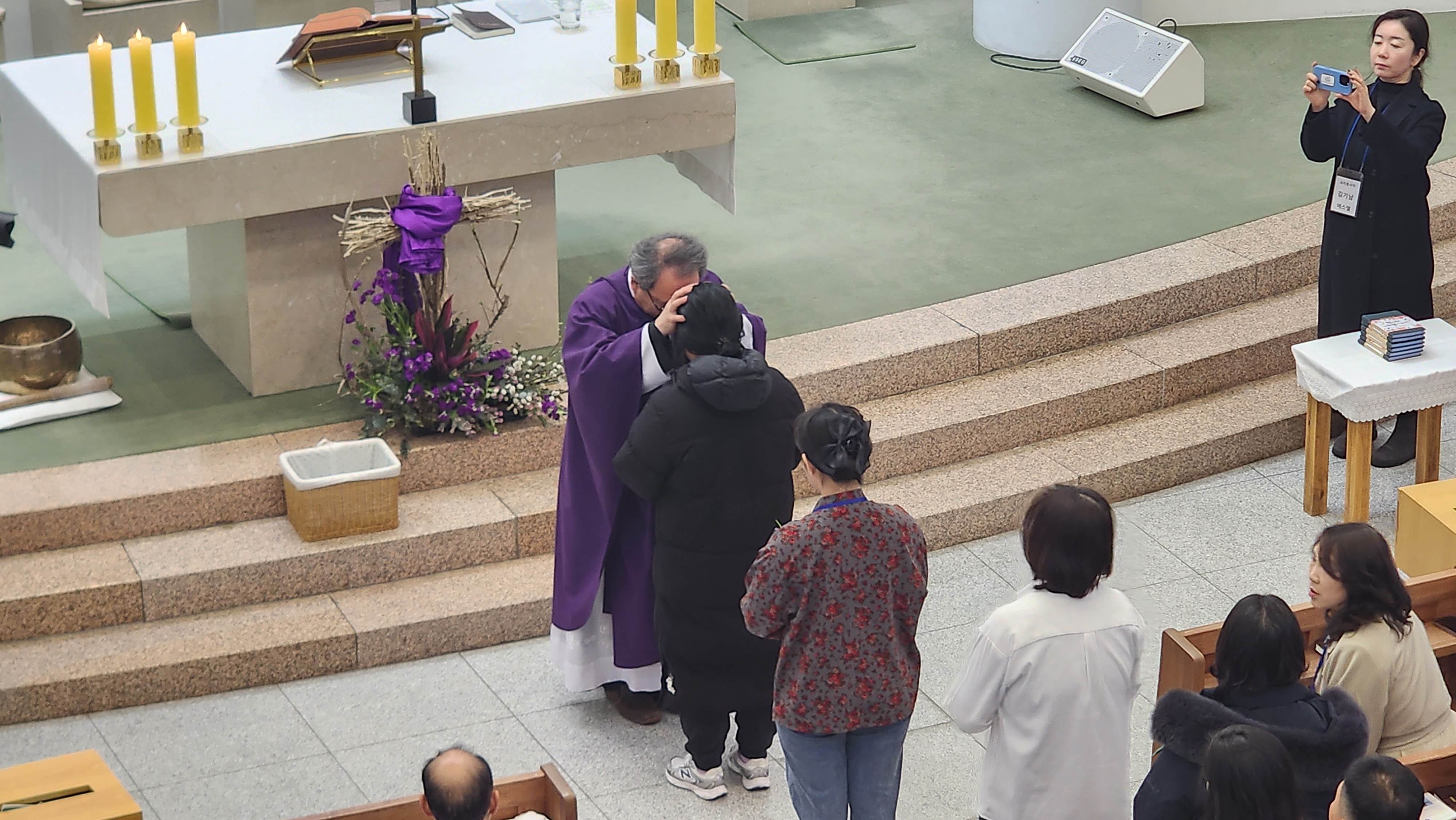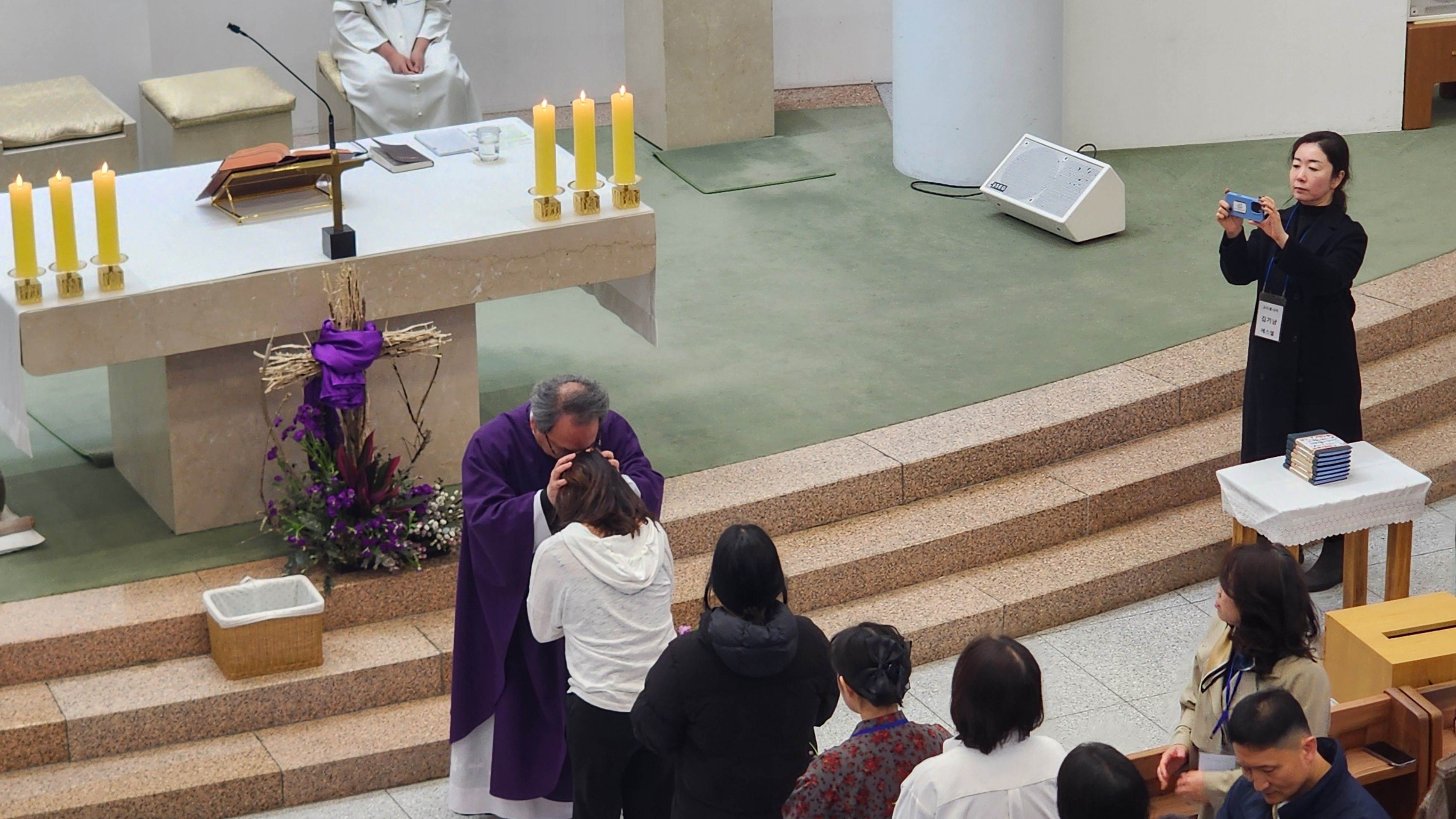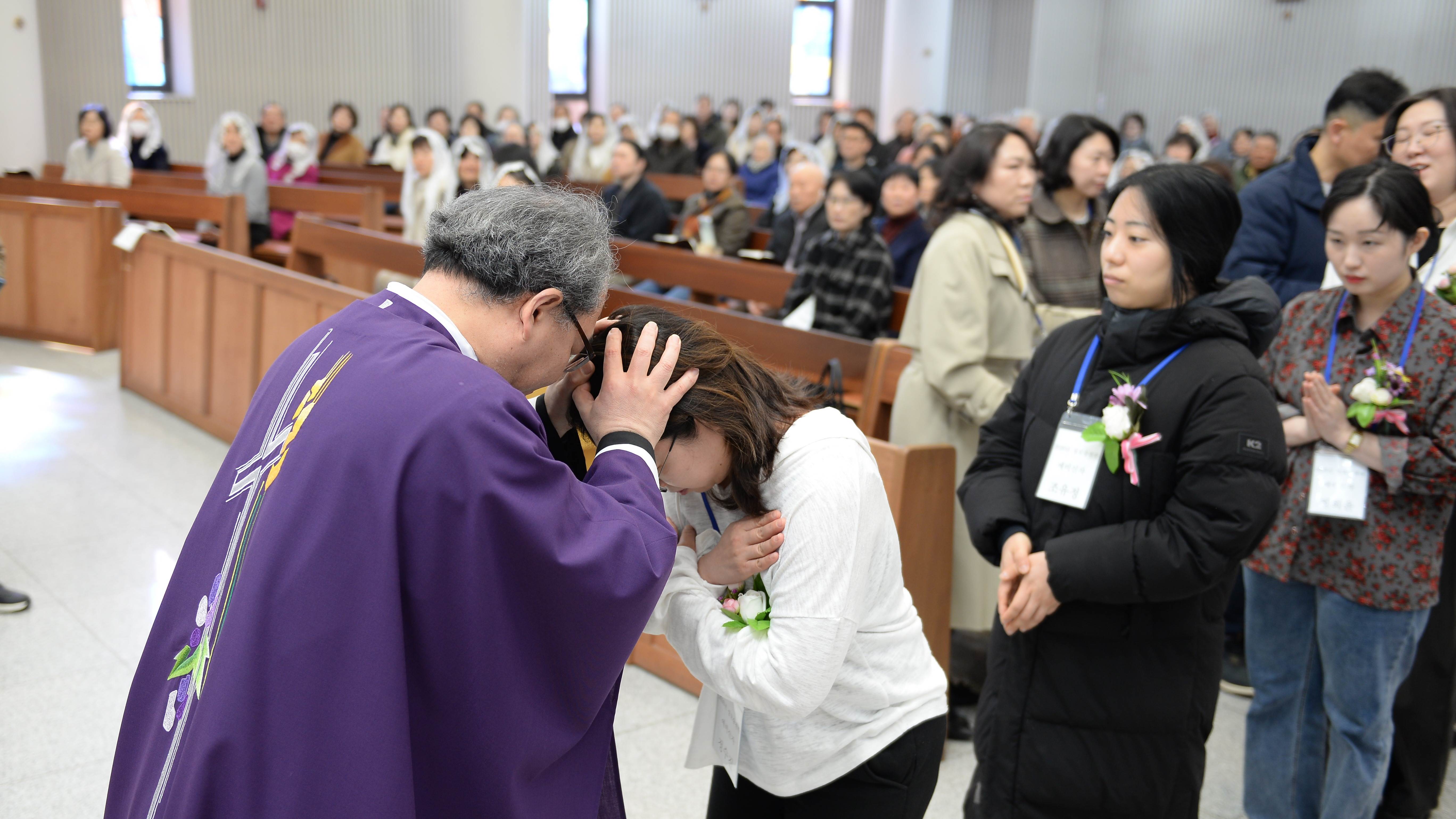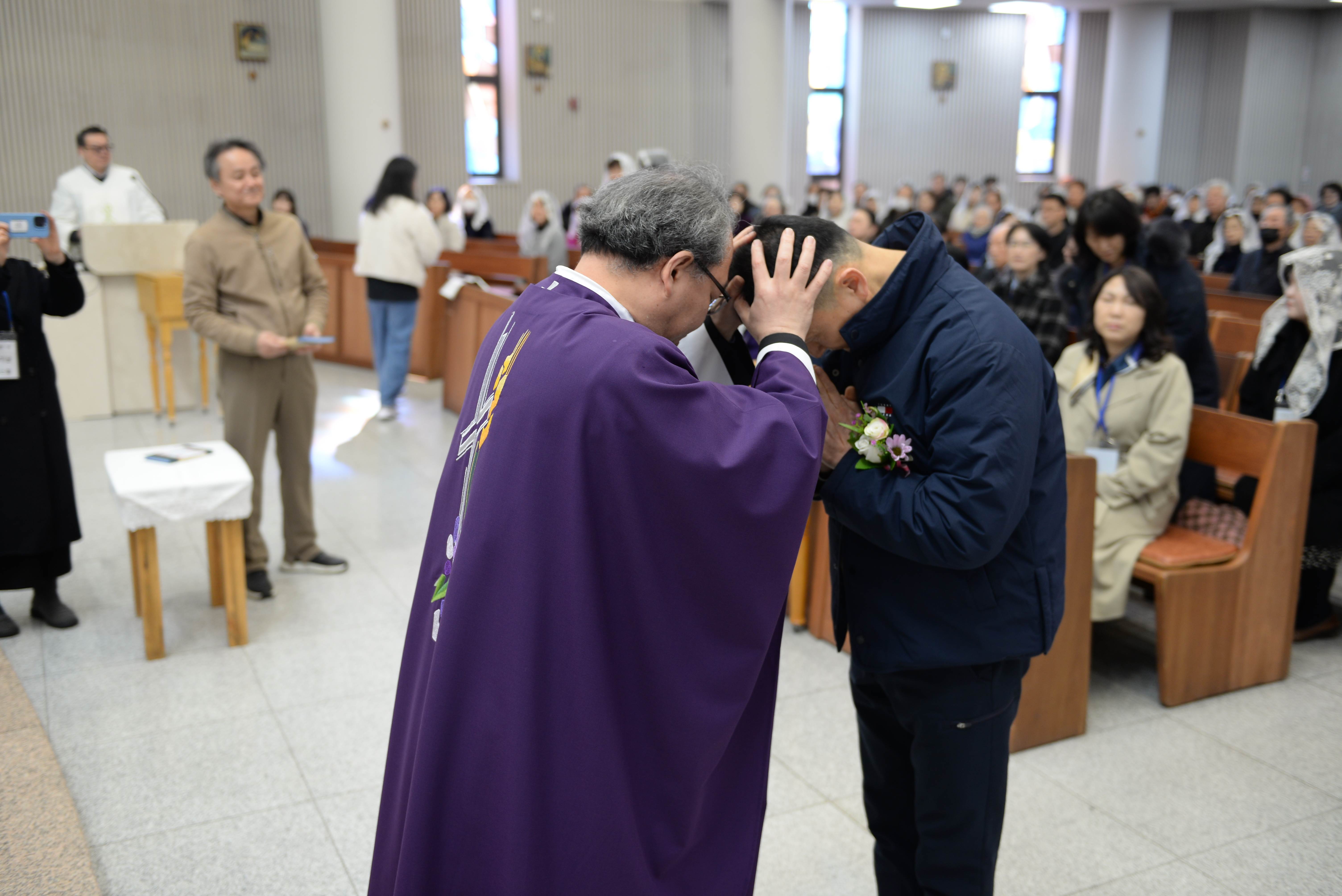 입교식 중에 신부님의 안수 예식이 이루어져 입교자들에게 하느님의 은총과 축복을 청하며,