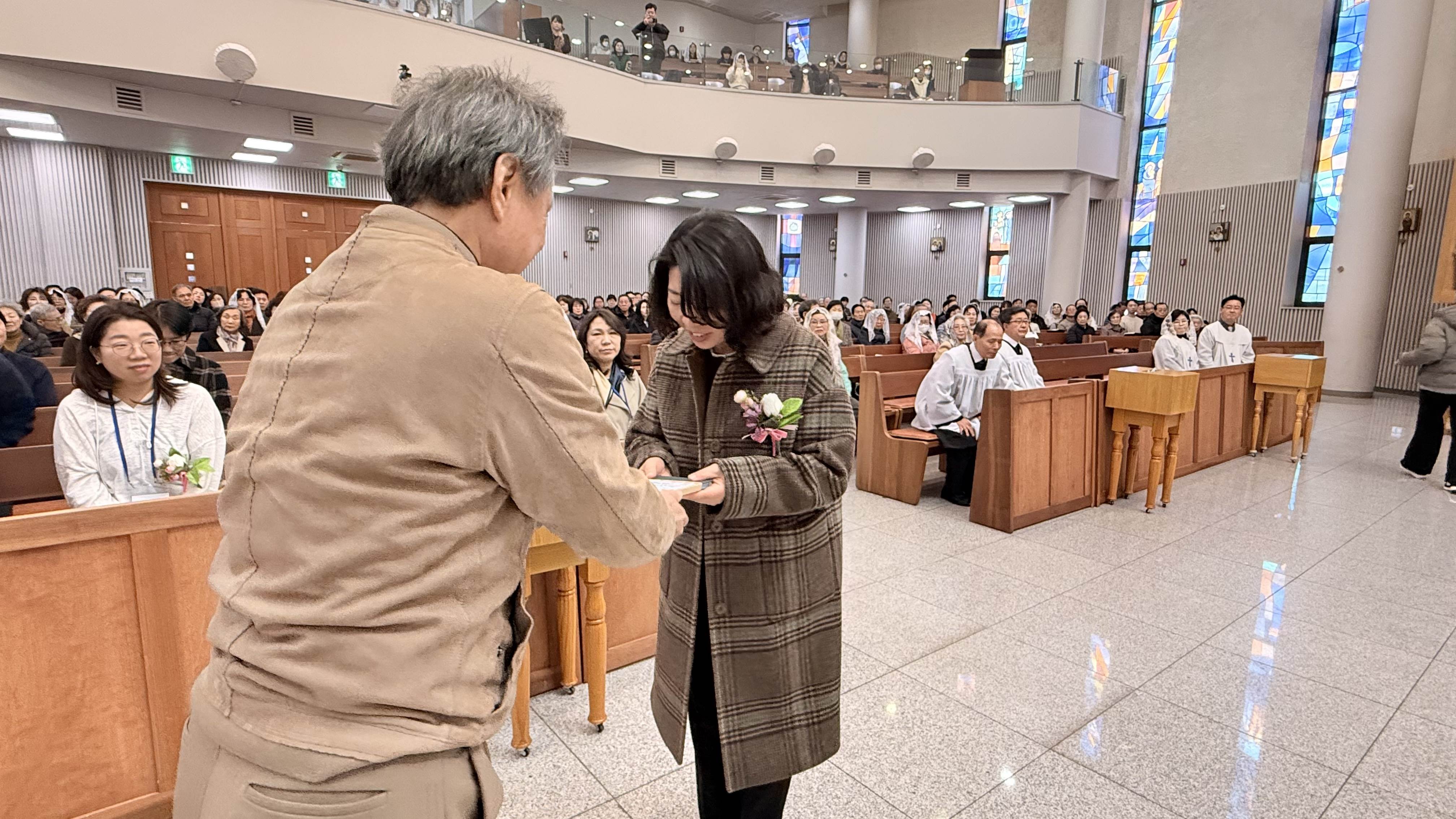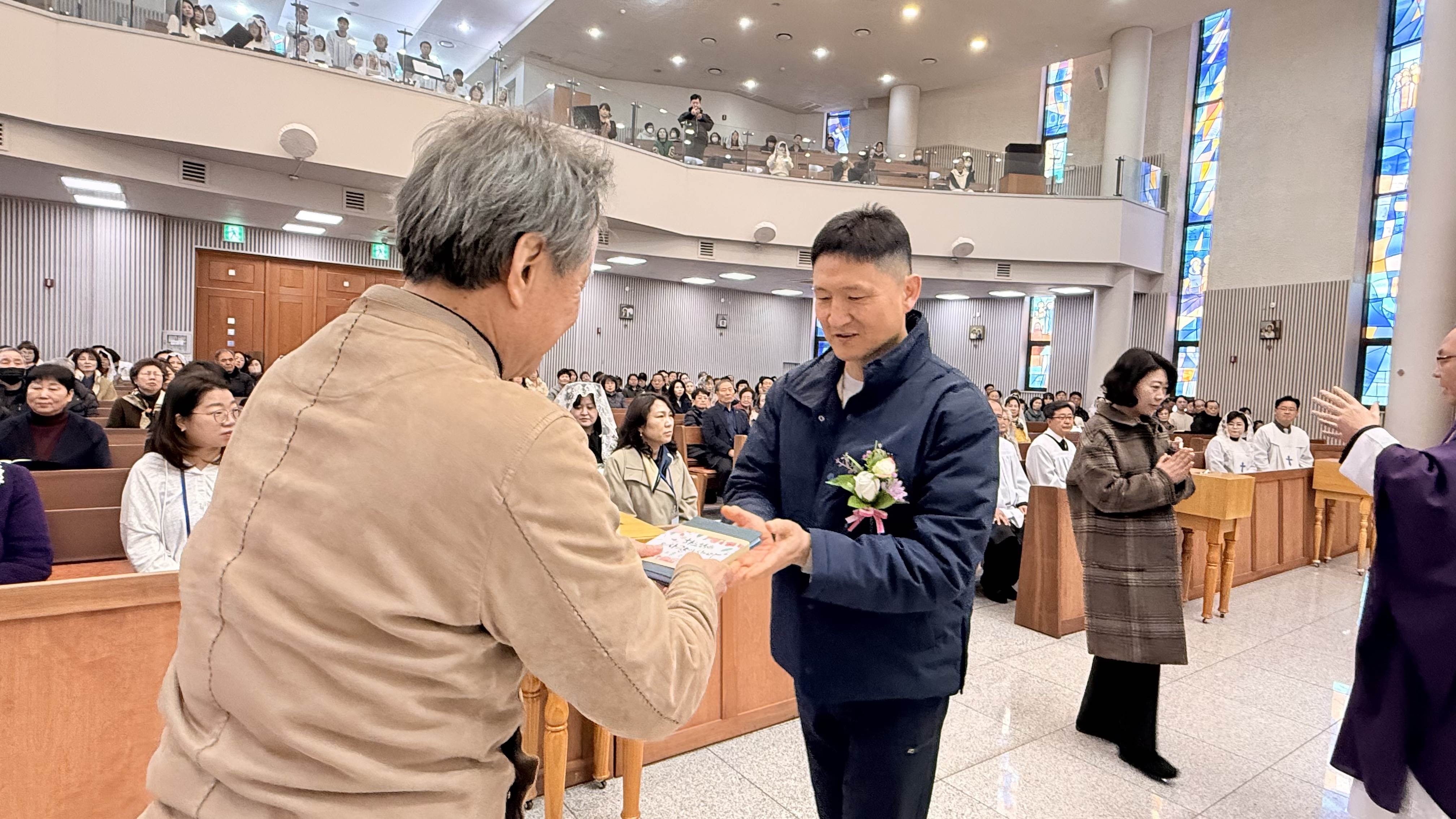 사목회장님은 입교자들에게 성경을 전달하며 하느님의 말씀을 가까이하고