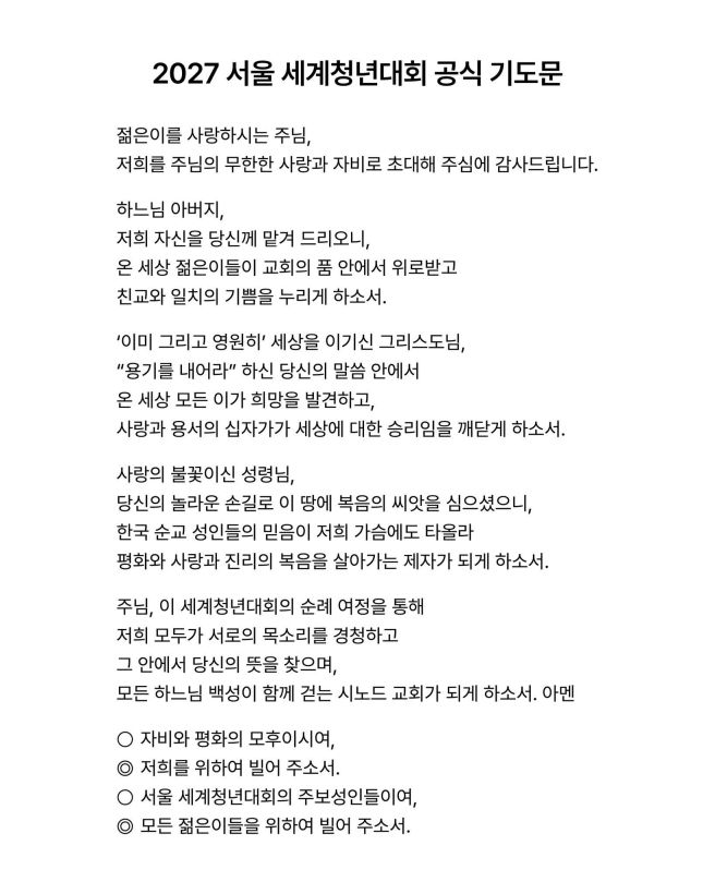 2027 서울 세계 청년대회 공식 기도문