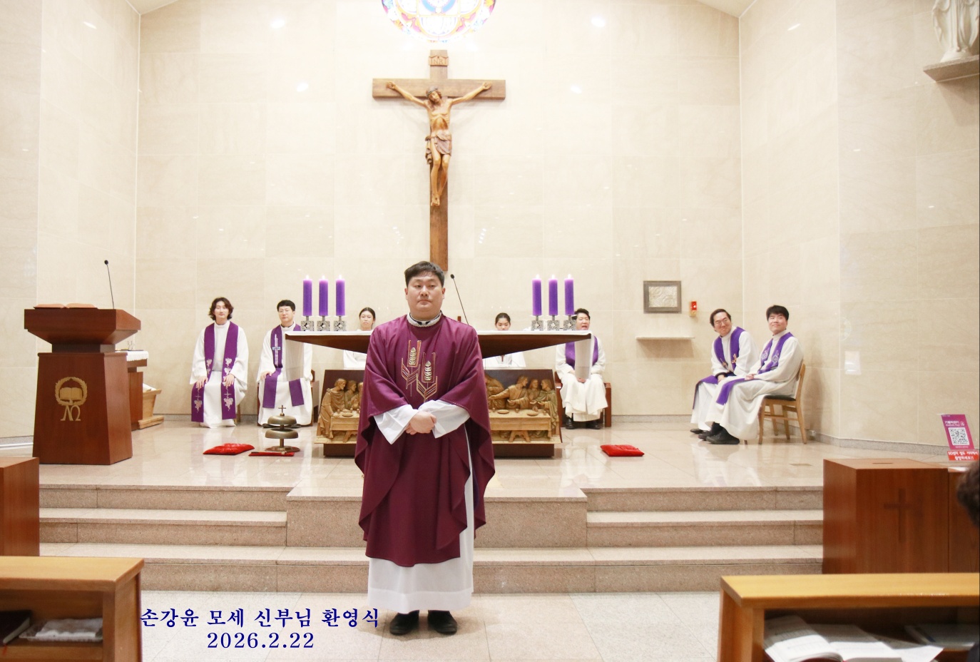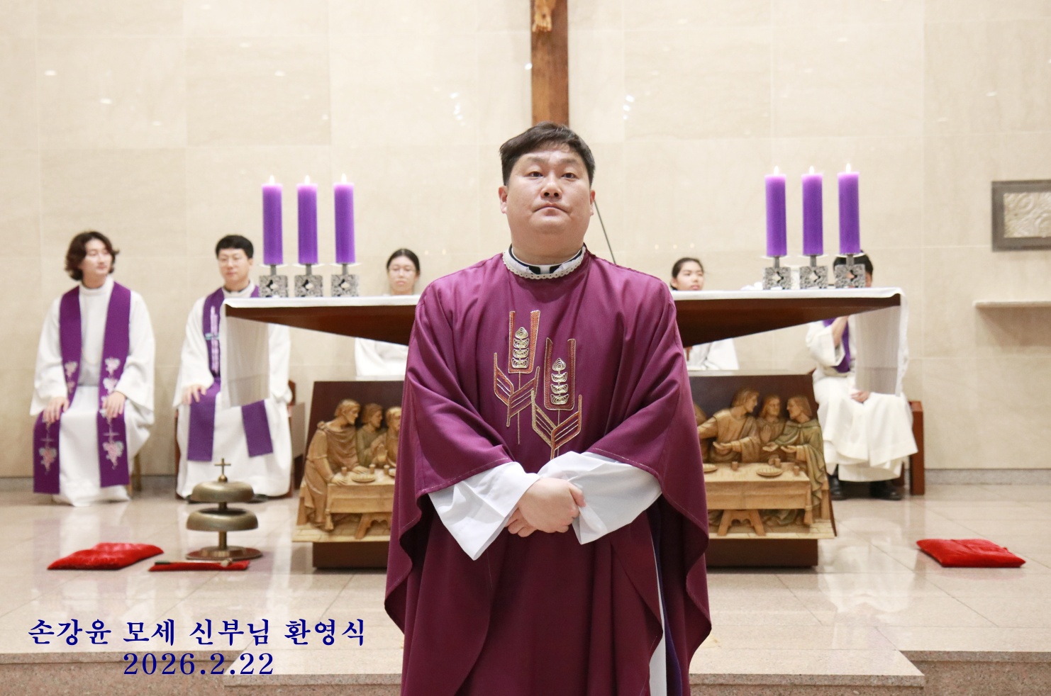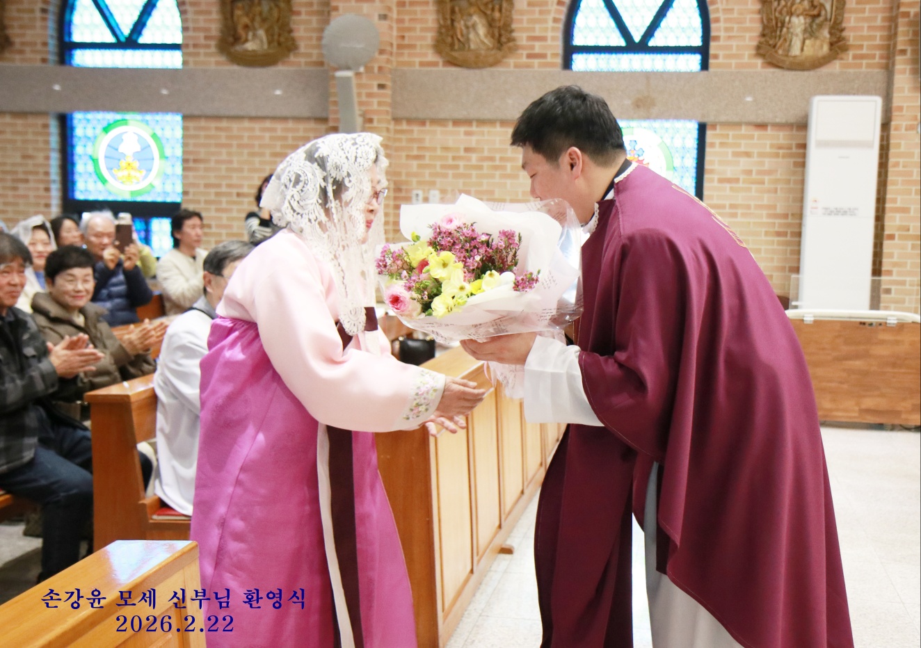2월 22일 교중미사 중에 손강윤 모세 주임신부님의 환영식이 있었습니다. 첫주임으로 발령 받으신 주임신부님을 축하해 주기 위해 오신 다섯분의 동기 신부님과 손님신부님이 함께 공동집전 하셨습니다. 안나회 어머님께서 꽃다발 증정식 하시고 성가대에서 특송 부르며 신부님을 부끄럽게 기쁘게 버선발로 환영해 드렸습니다.^^