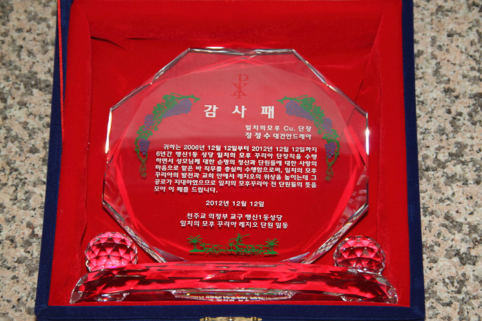 귀하는 2006년 12월 12일 부터 2012년 12월 12일 까지 6년간 행신1동 성당 일치의 모후 꾸리아 단장직을 수행하면서 성모님께대한 순명의 정신과 단원들에 대한 사랑의 마음으로 맡은 바 직무를 충실히 수행함으로써, 일치의 모후 꾸리아의 발전과 교회안에서 레지오의 위상을 높이는데 그 공로가 지대하였으므로 일치의 모후 꾸리아의 전단원들의 뜻을 모아 이 패를 드립니다.