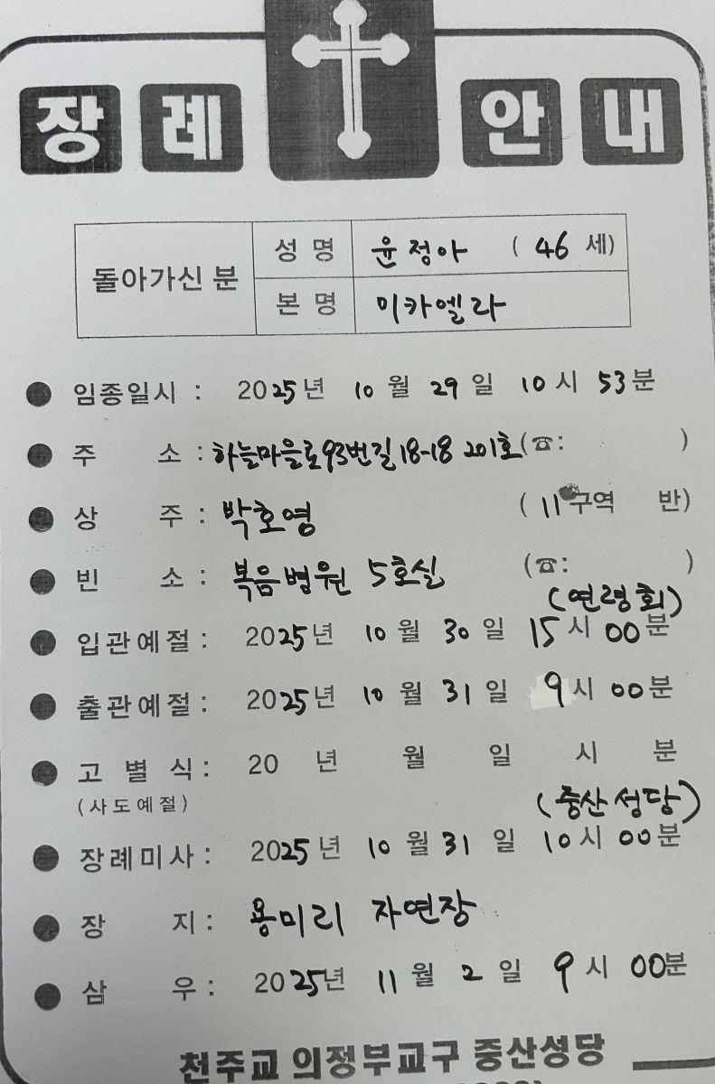<연도 공지>윤정아 미카엘라 장례 미사 10/31(금) 10시, 대성전