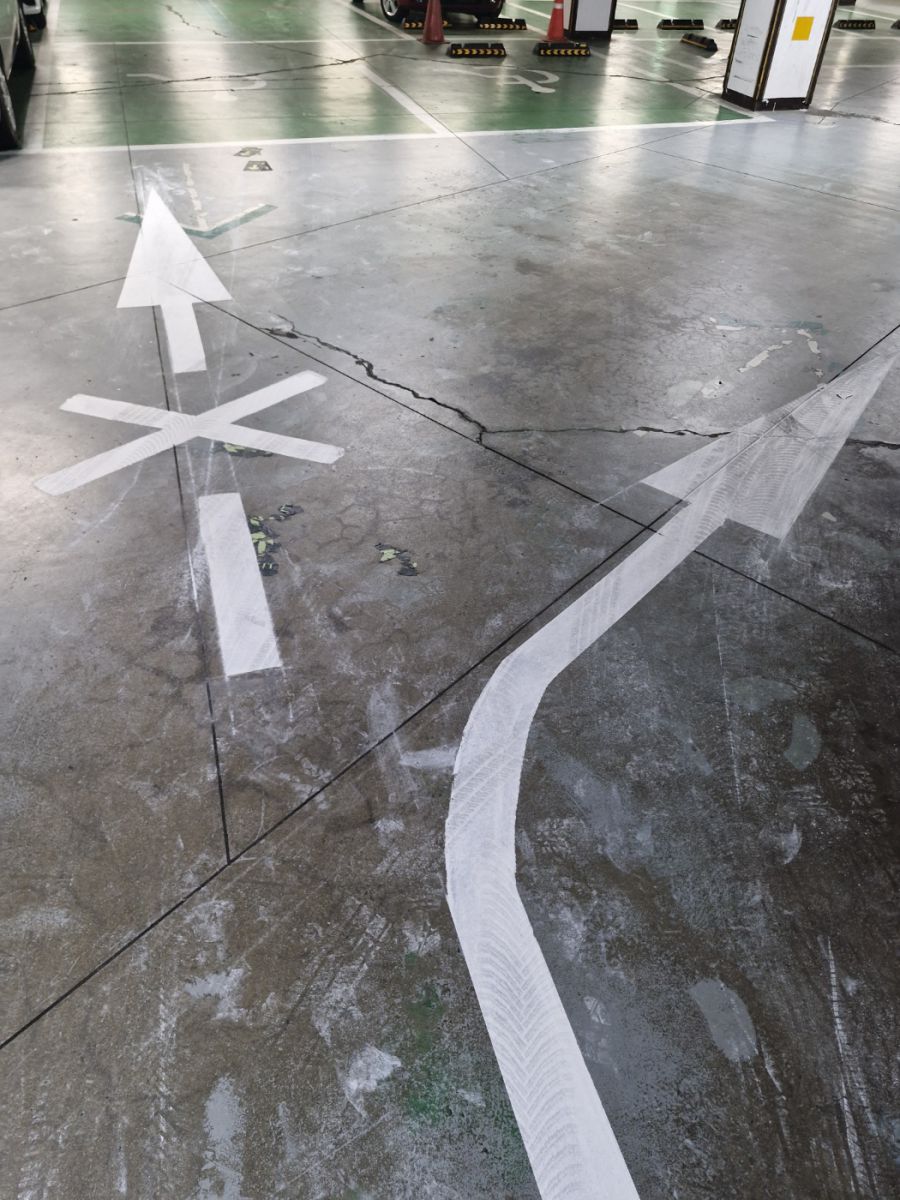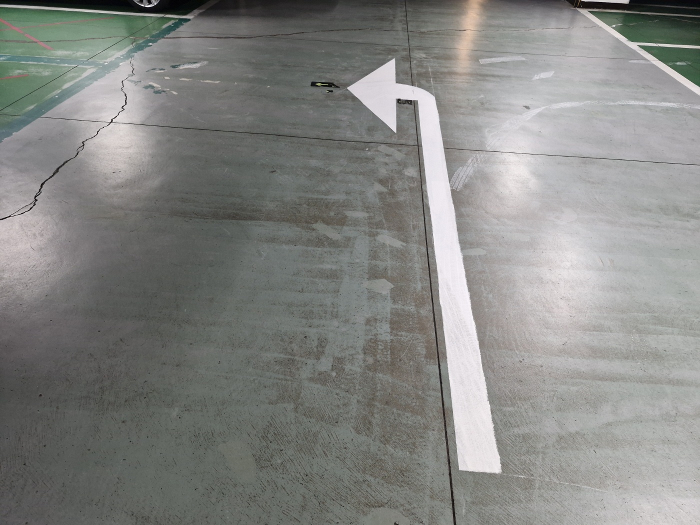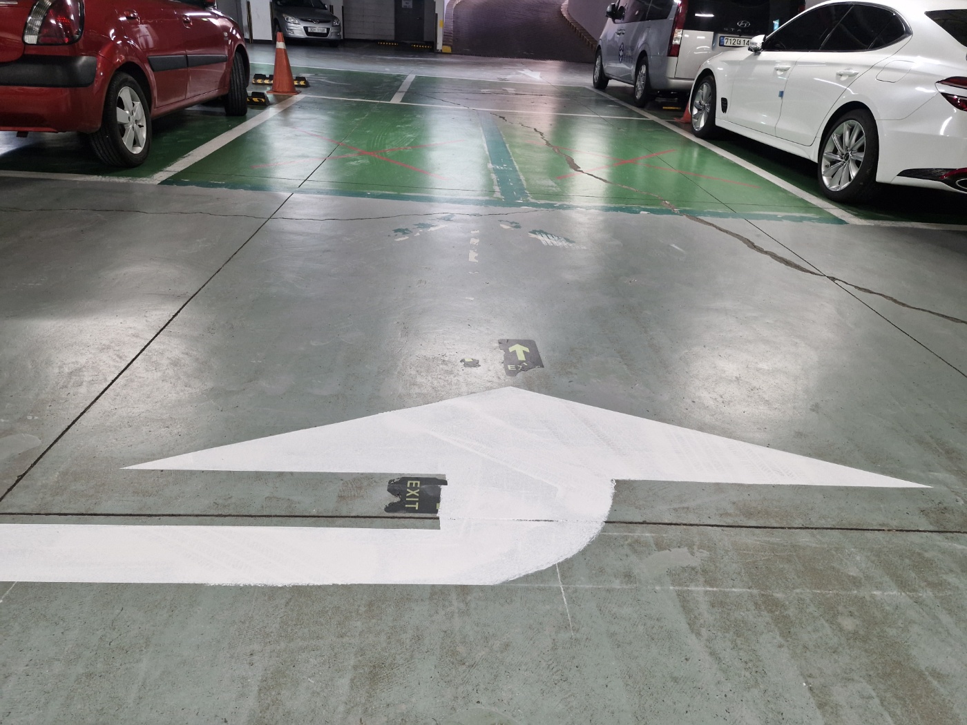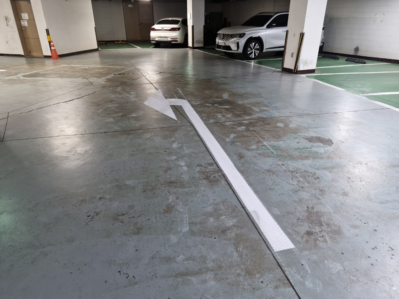 지하 주차장에 진입한 차량은 우회전하여 회전하시도록 바닥에 화살표로 표시하였습니다.