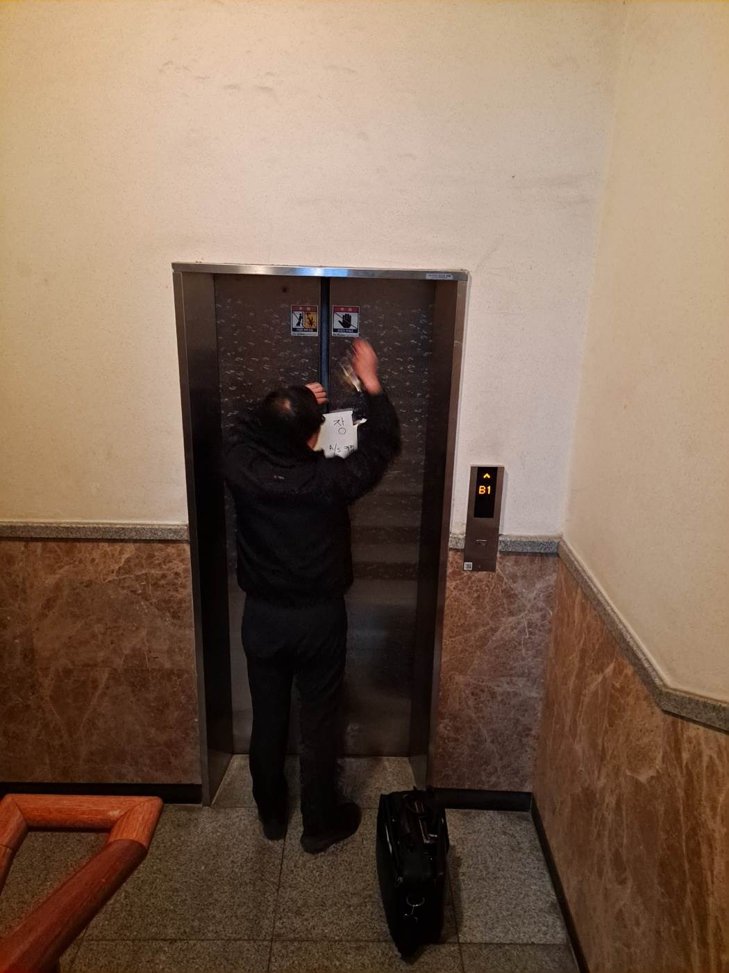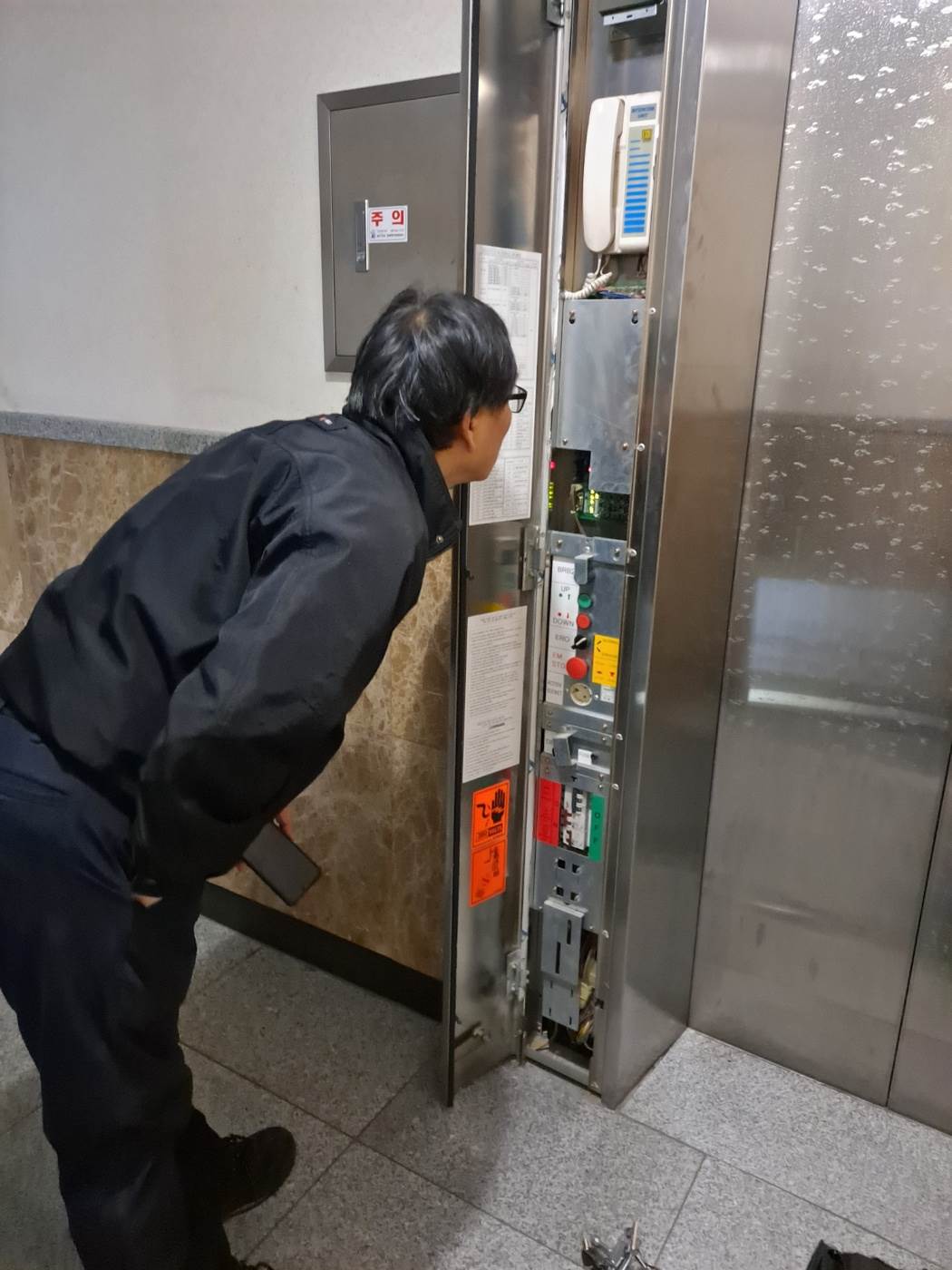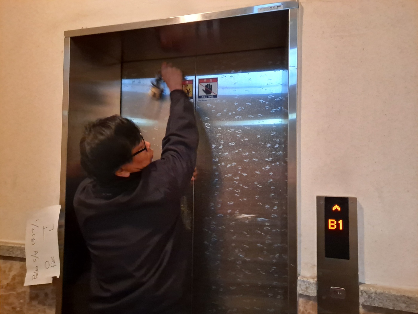 엘리베이터 안쪽 도어 센서 오작동으로 인한 고장이었습니다.