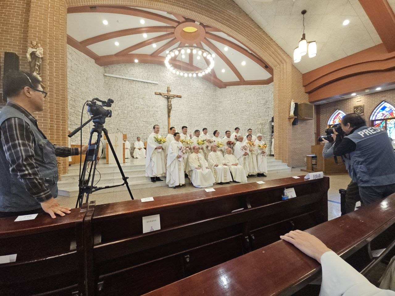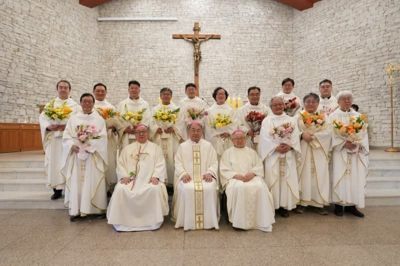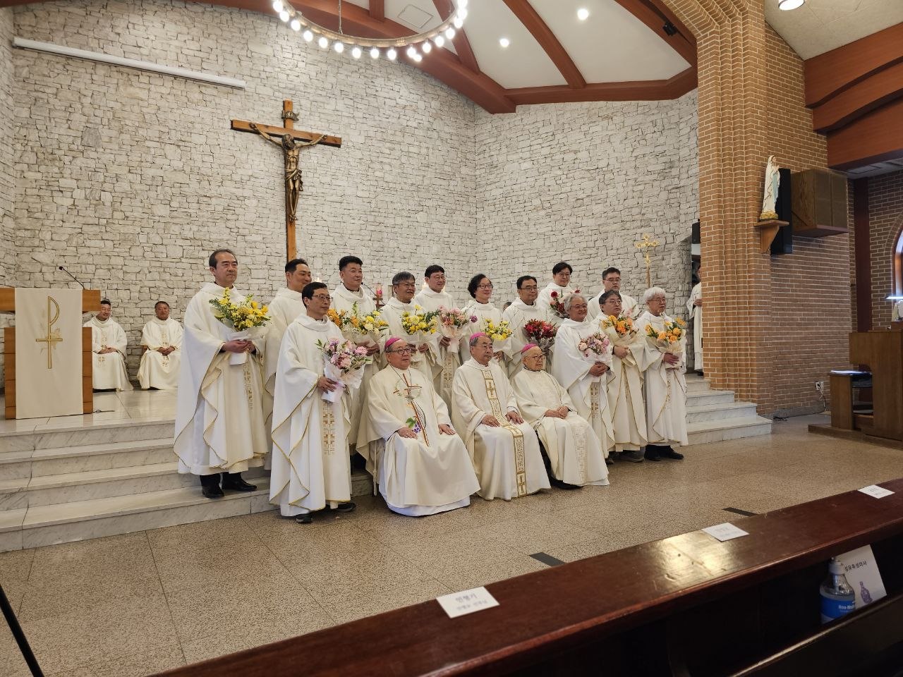 의정부 교구에서는 매해 성유축성 미사 끝에 사제 수품 25주년을 맞은 신부님들을 위한 소박한 축하식을 갖는다. 올해는 2001년에 사제품을 받은 사제들이 대상이다. 미사에 참석한 은경축 대상 사제 12명에게 꽃다발과 선물을 전하고 나서 내가 축하 인사를 했다.