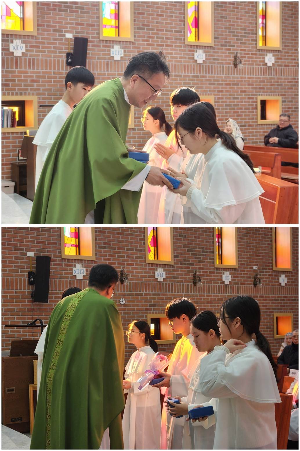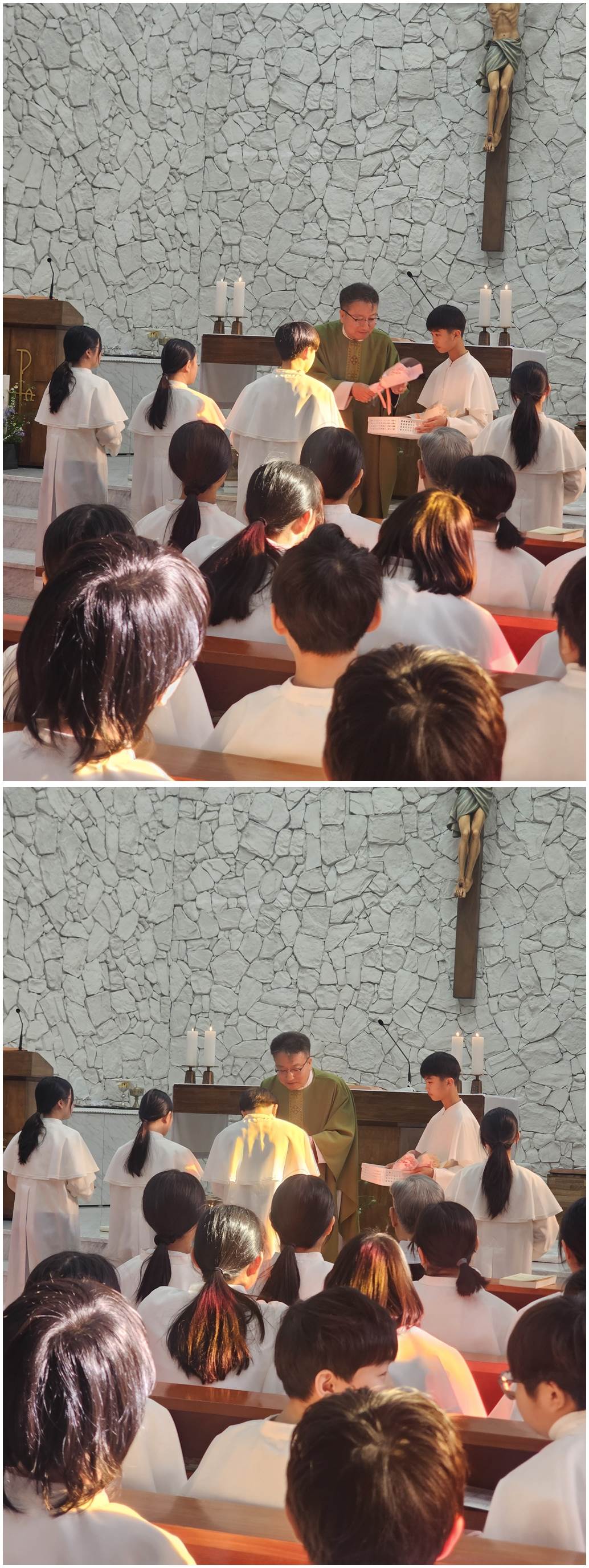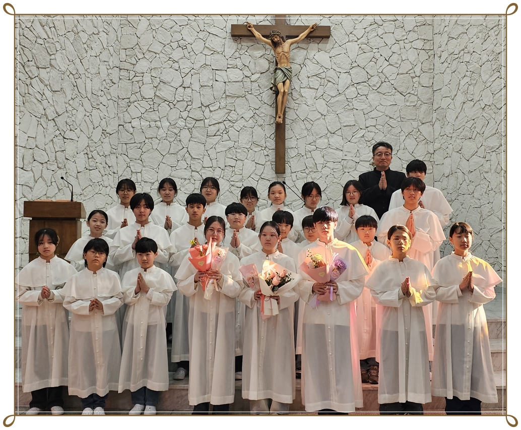 복사단 활동은 제대 준비, 미사 도구 전달, 미사 전후 예절, 공동체 질서를 배우며 신앙과 책임감을 함께 키우는 과정으로 초등학교 3학년(첫영성체 이후)부터 중학교 3학년까지 활동할 수 있습니다.