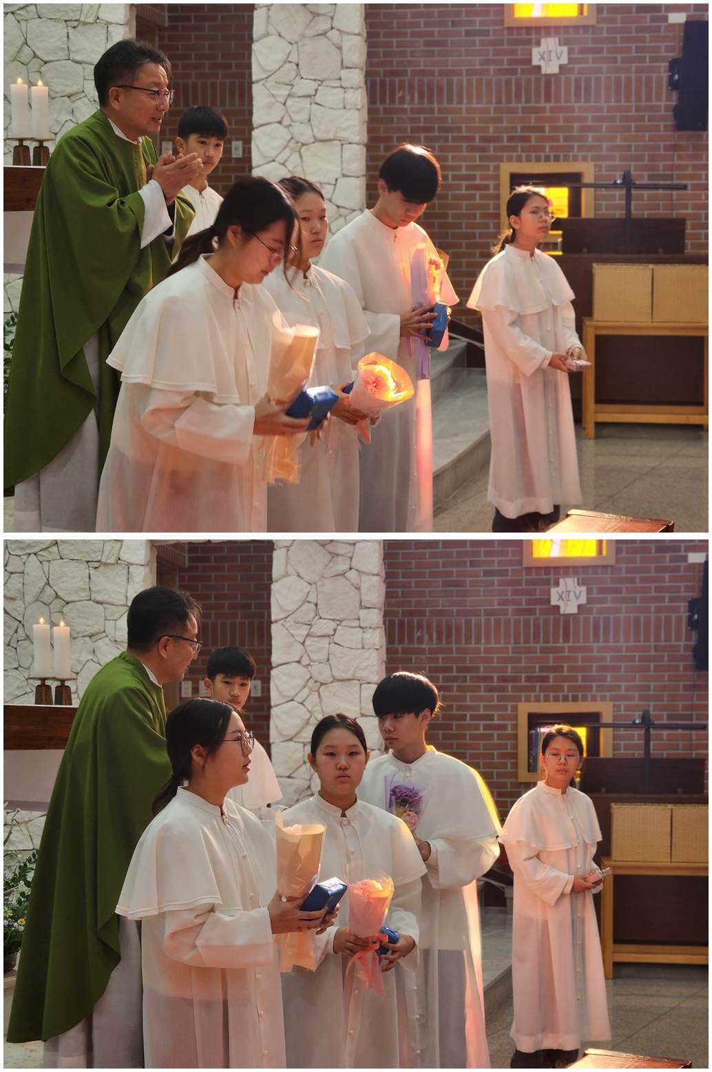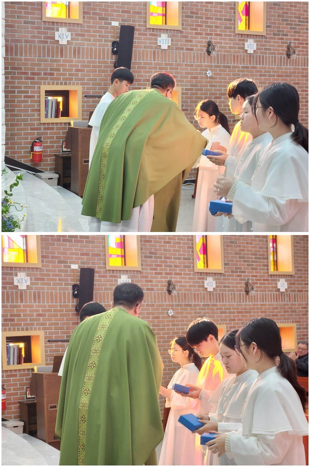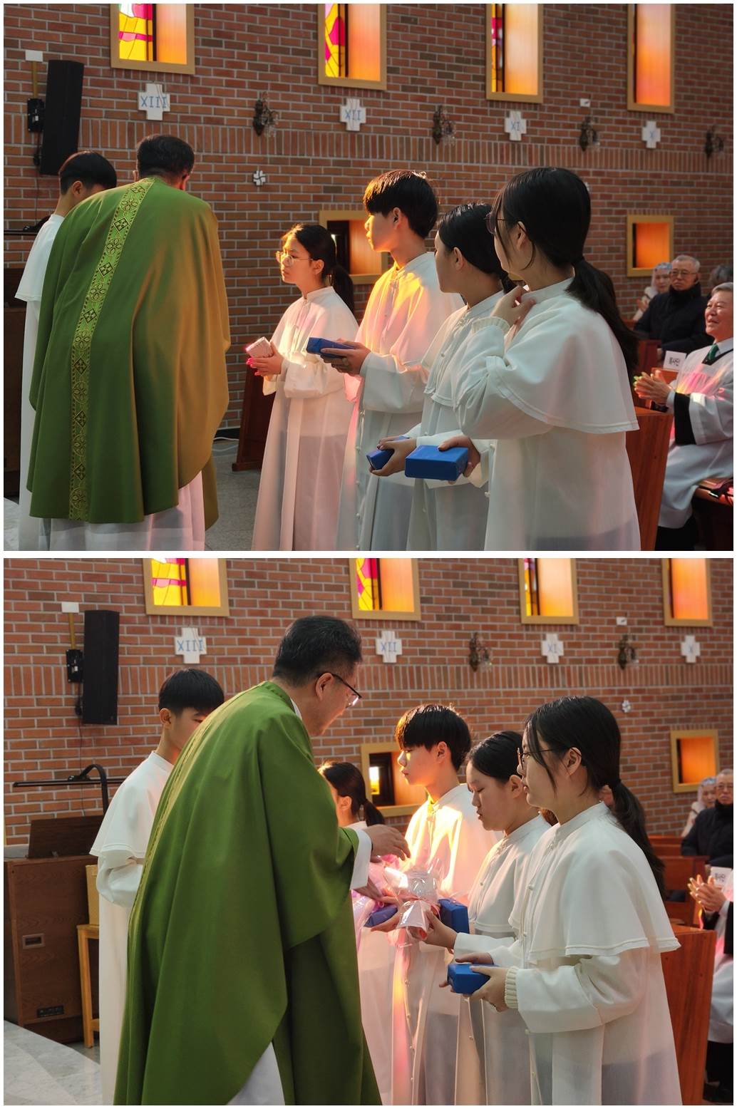 복사단 활동은 제대 준비, 미사 도구 전달, 미사 전후 예절, 공동체 질서를 배우며 신앙과 책임감을 함께 키우는 과정으로 초등학교 3학년(첫영성체 이후)부터 중학교 3학년까지 활동할 수 있습니다.