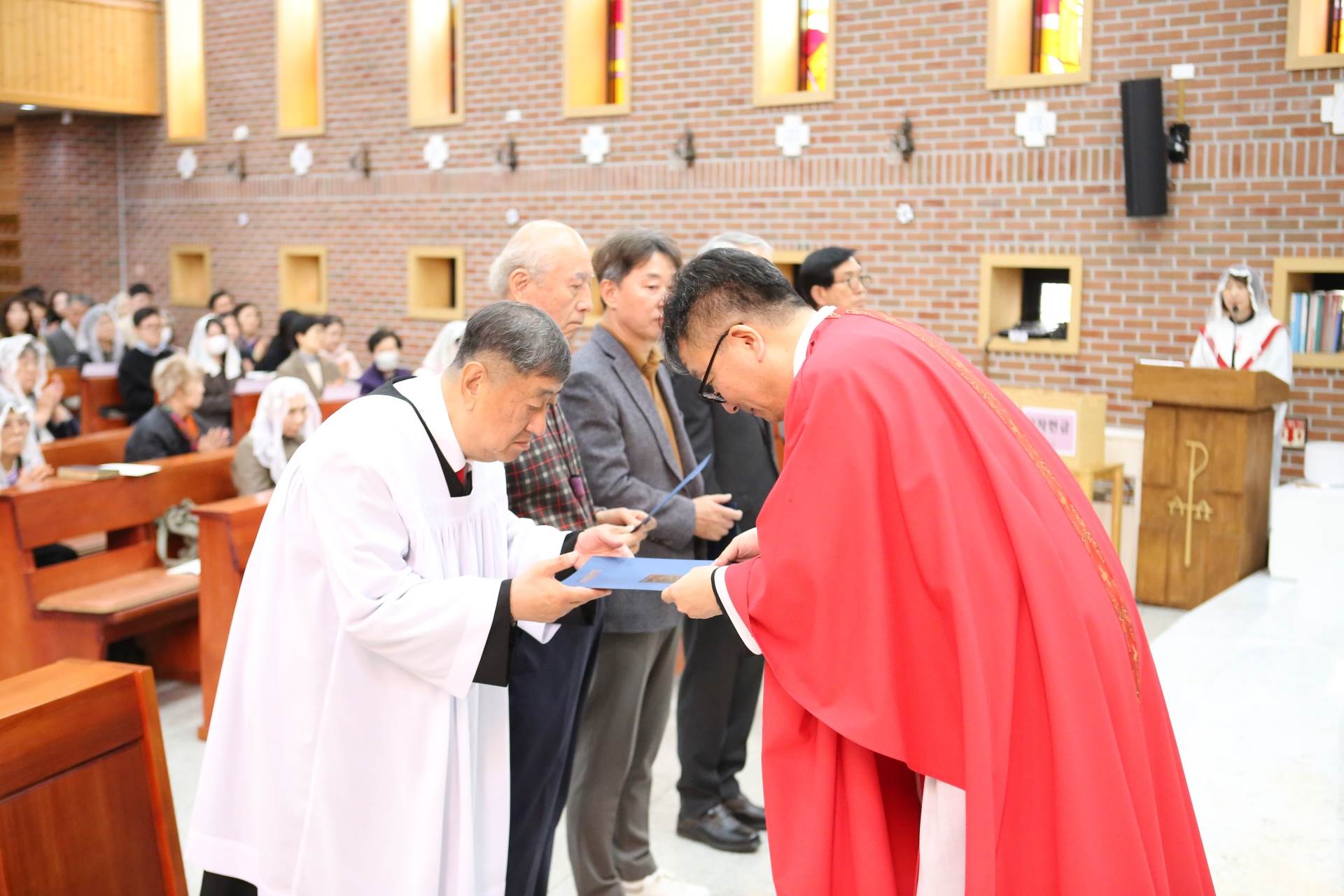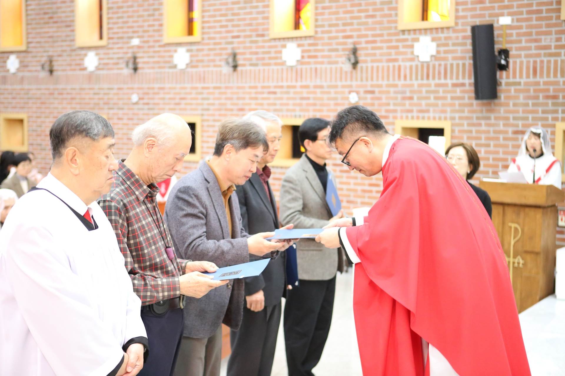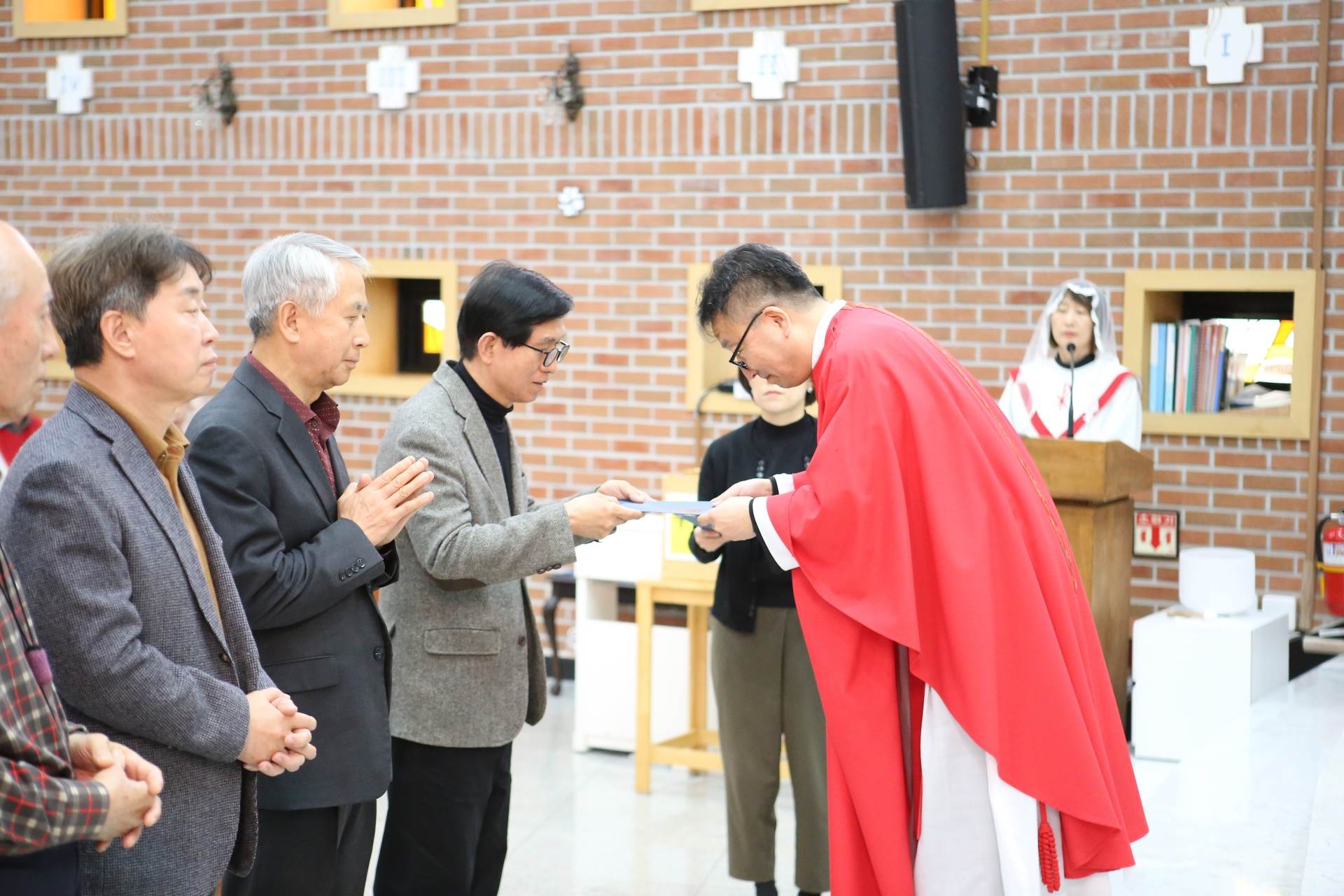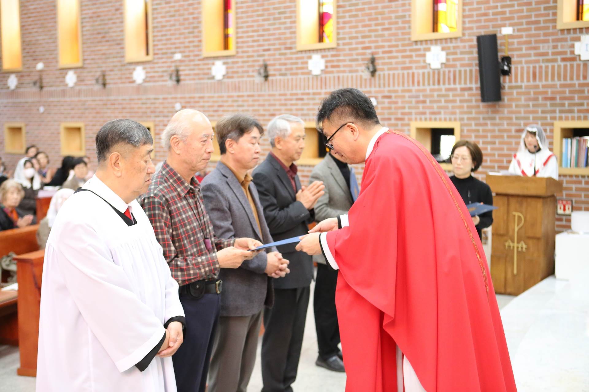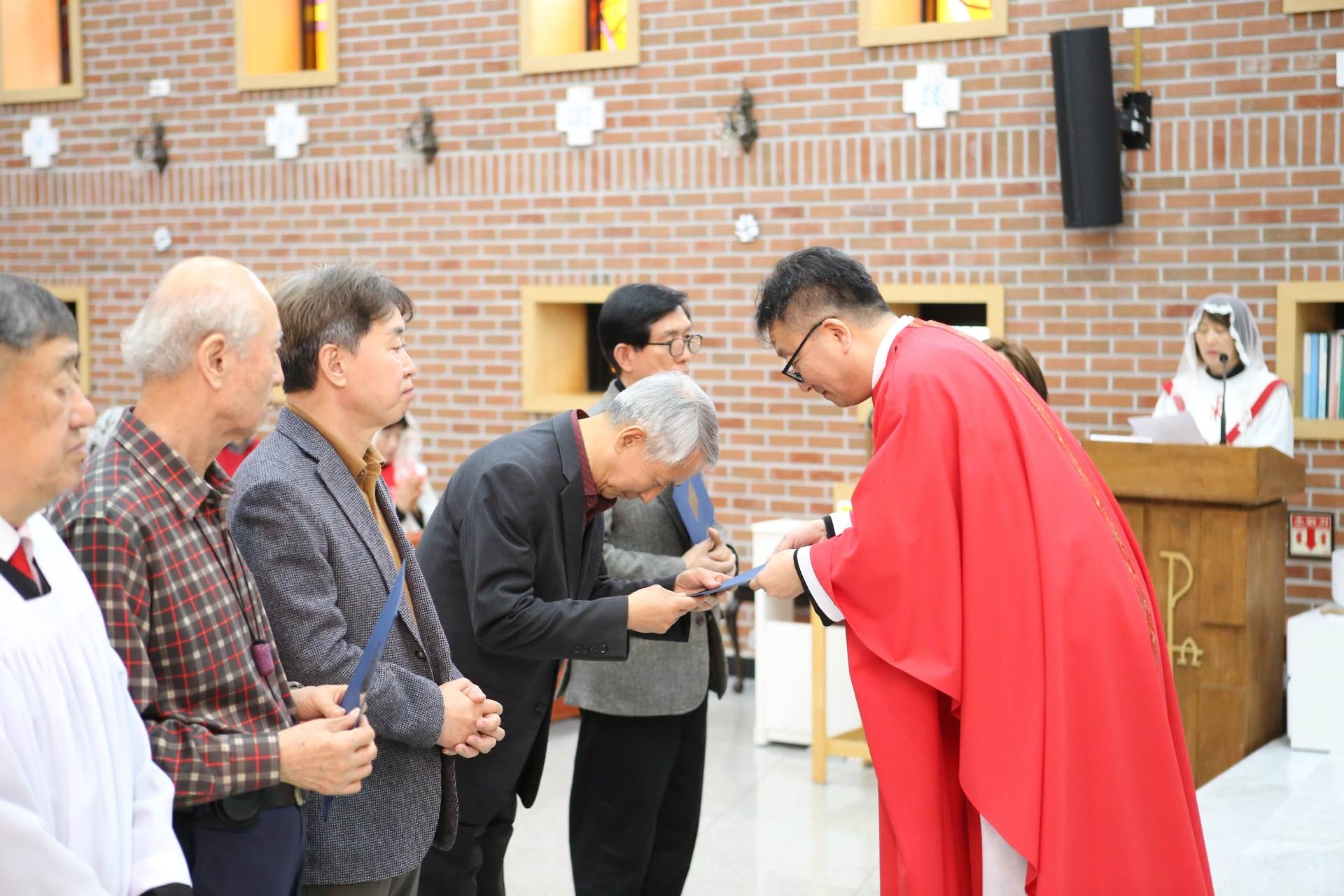 3월29일(주일) 교중미사 시간에 성체분배자교육을 수료한 이들에 대한 임명장 수여식이 있었습니다. 이 임명장을 받은 이들은 이제부터 성찬의 전례(미사)에서 성체를 분배할 수 있게 됩니다.
