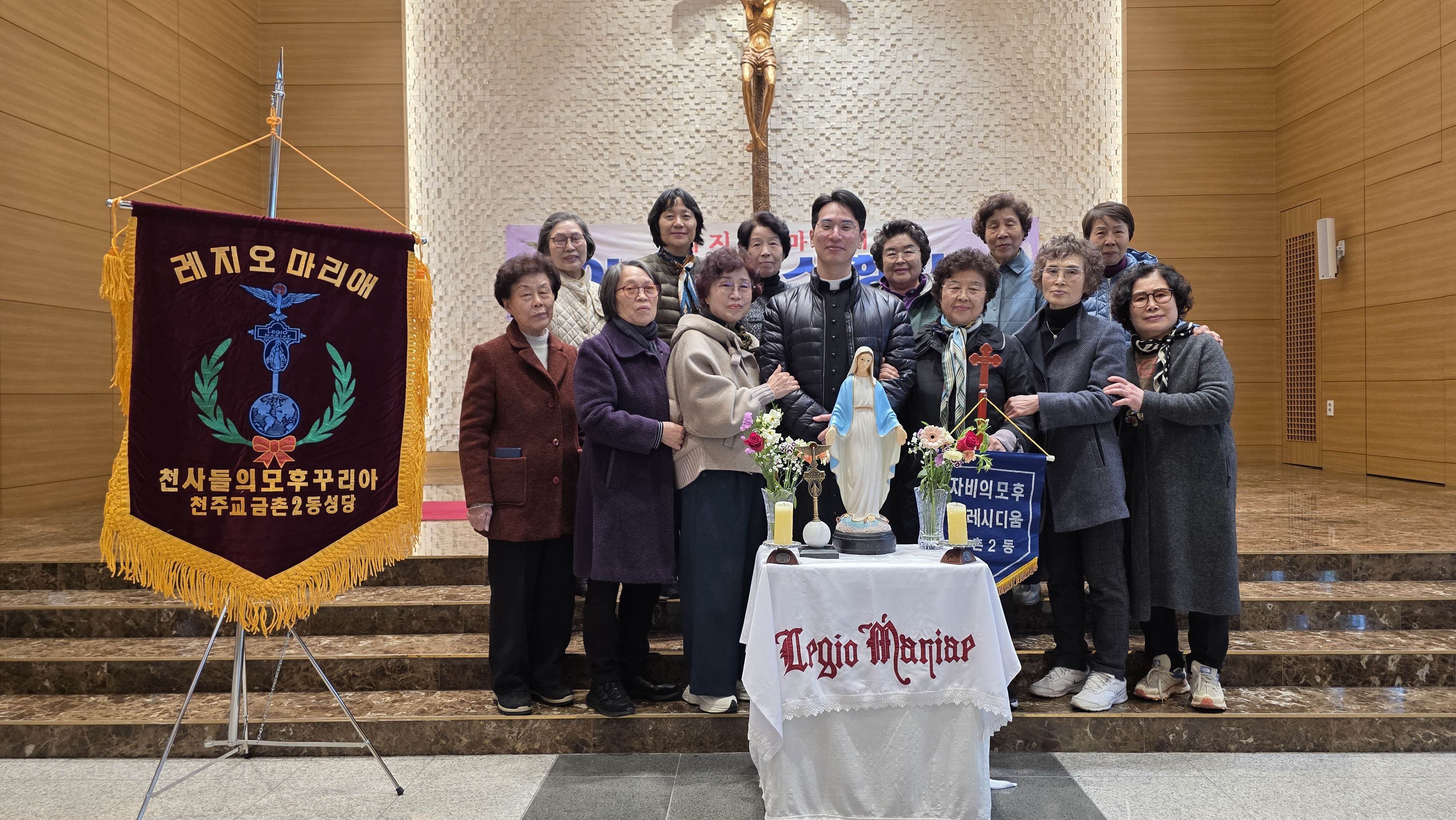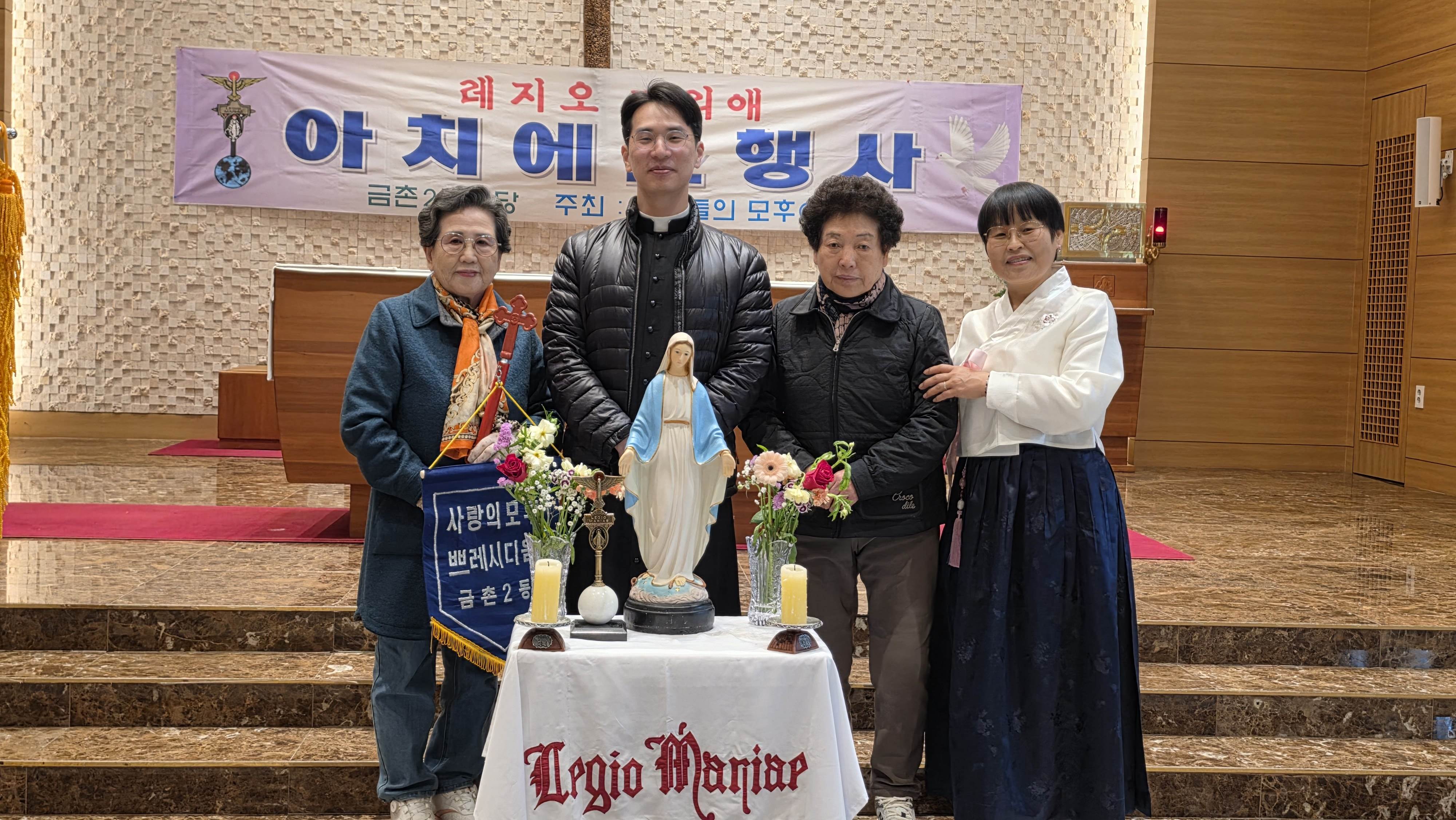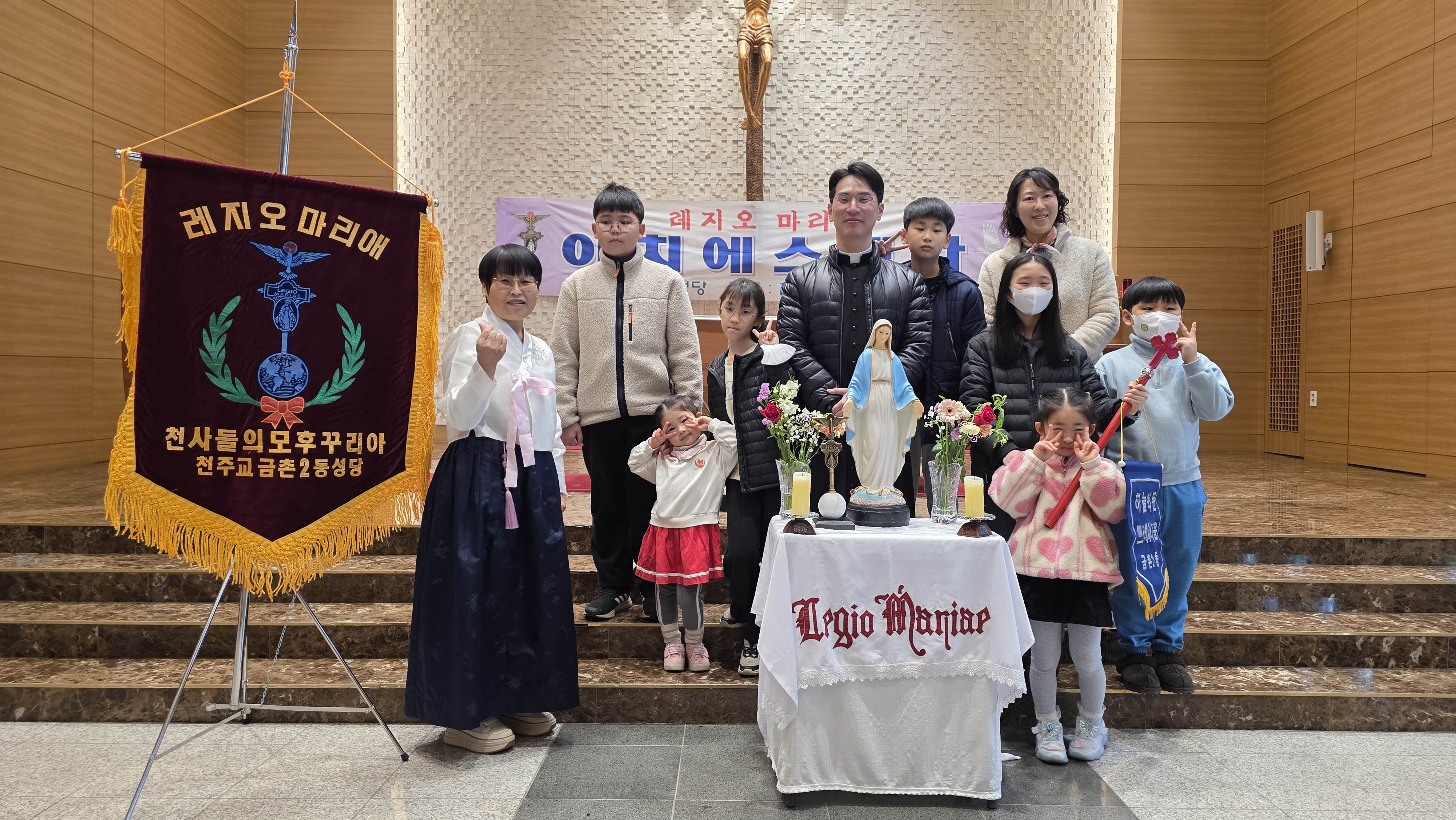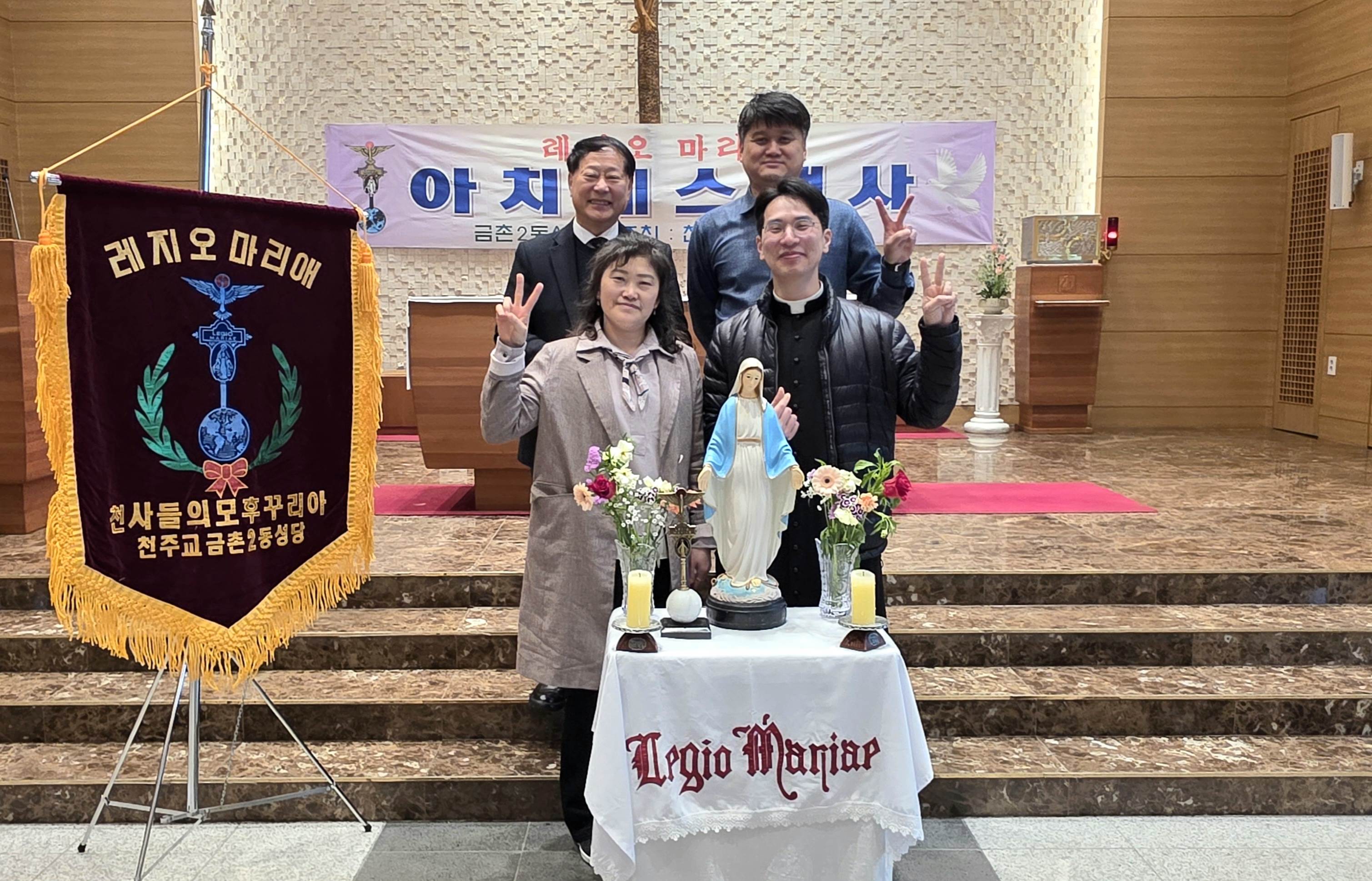 3월15일 아치에스 행사가 있었습니다. 교중미사후 김밥을 간단히 먹고 1층에서 레지오 단기를 들고 2층 성전으로 레지오 단가를 부르며 이동했습니다. 너무 오래 서서 묵주기도를 해서 다리가 아팠지만 많은 의미가 있었습니다.