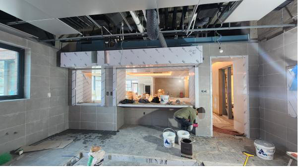 주방 배식구 부위 벽 타일 마감
