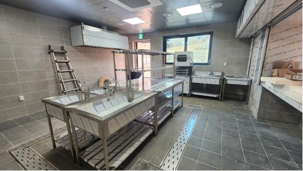 주방기구 1차 반입 설치(잔반처리대, 세척싱크, 메인싱크, 조리대, 식기세척기)