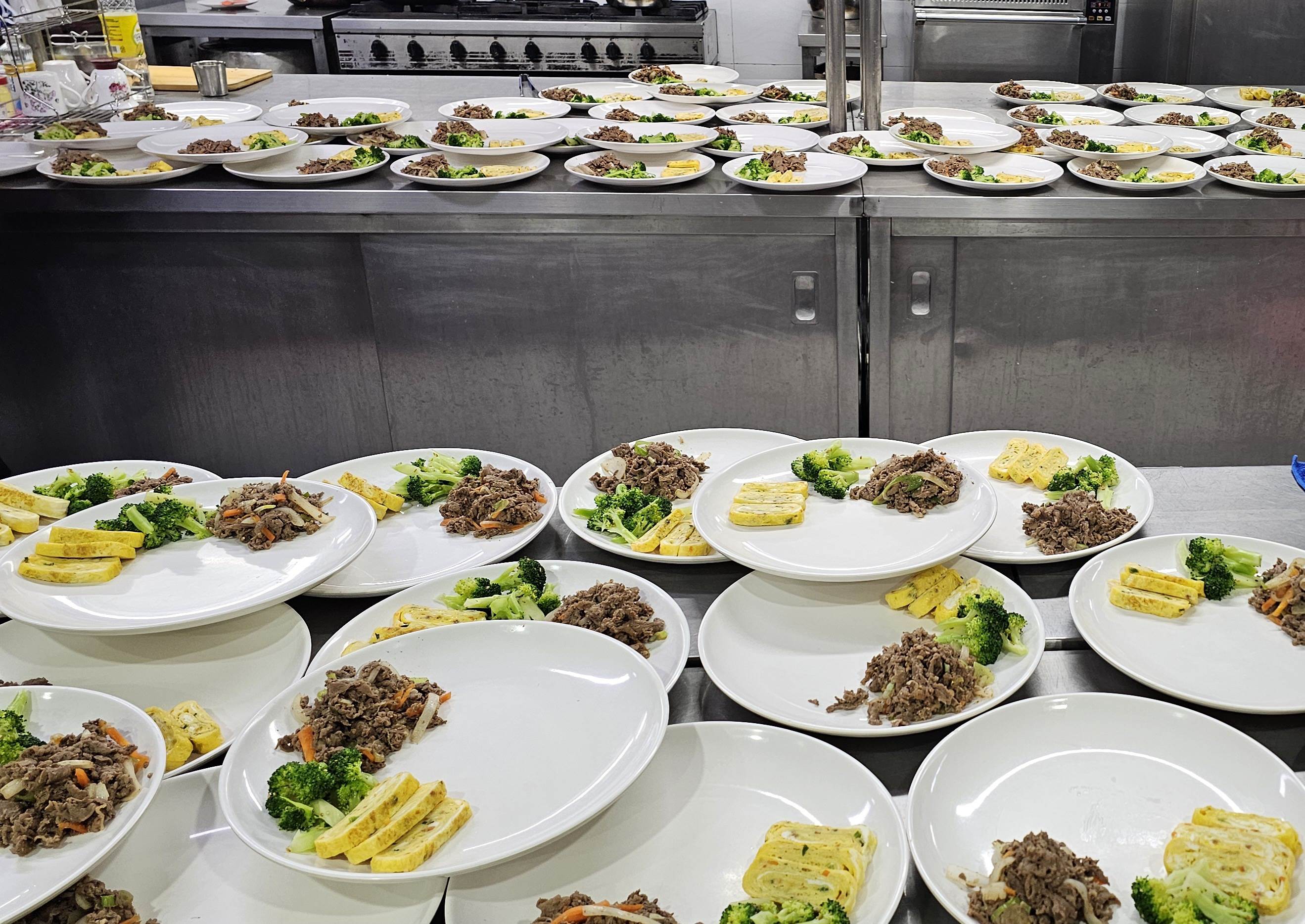 막강 주방팀의 소불고기, 브로컬리, 계란말이, 겉절이김치와 김치콩나물국으로