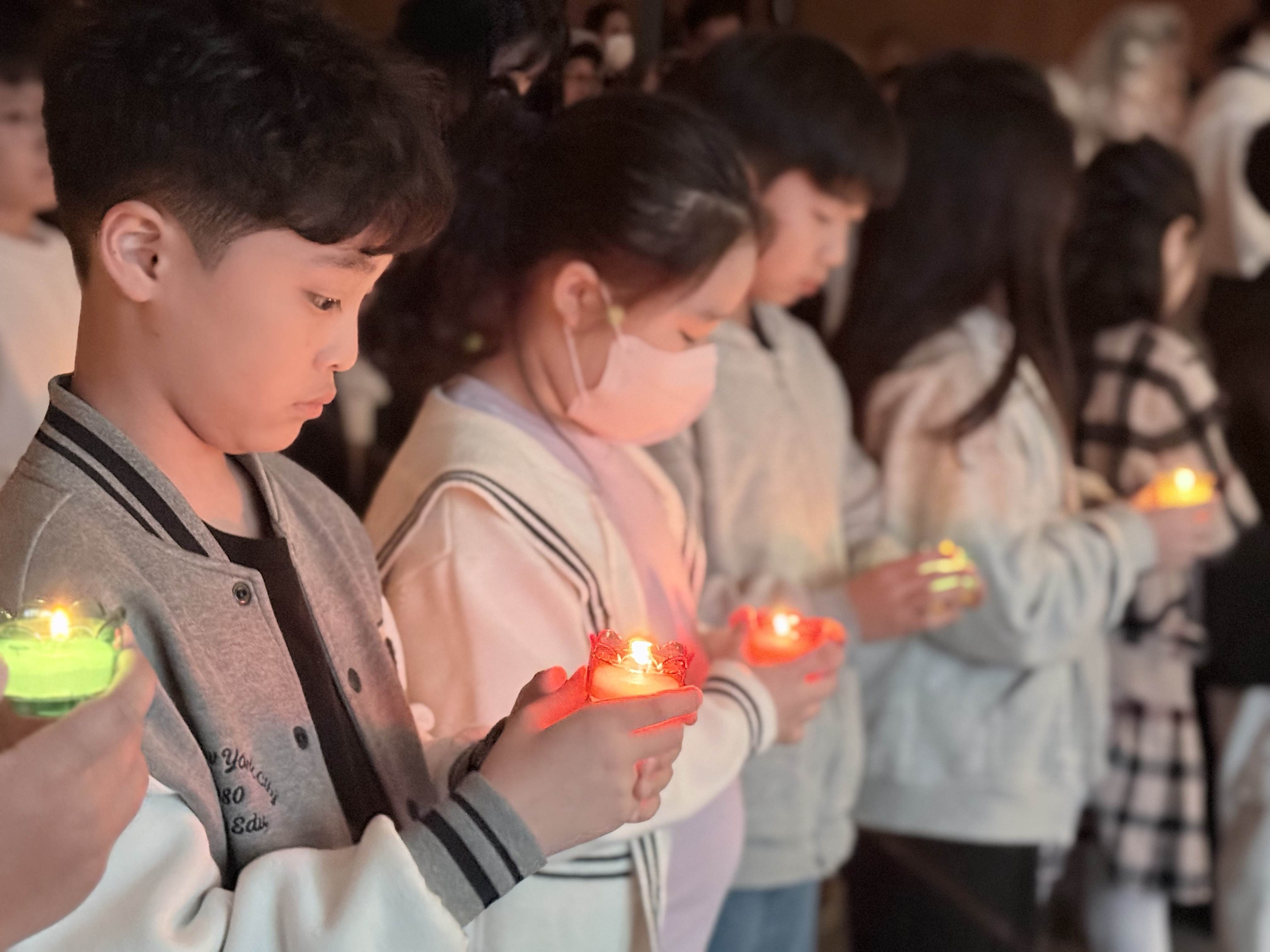 '하느님 감사합니다'로 응답하고 파스카 초로부터 빛을 모두 나눠 붙입니다.
