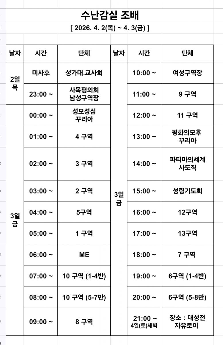 2026년 수난감실 성체조배 시간표